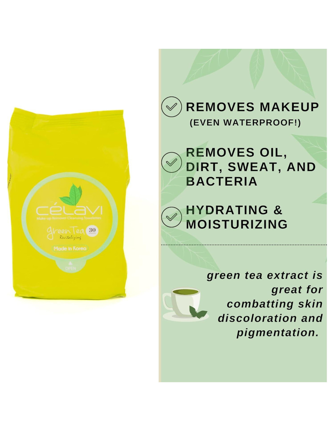 Las toallitas desmaquillantes de té verde te ayudan a limpiar tu maquillaje en cualquier momento del día y de la noche. Levanta lentamente el sello frontal y retira las toallitas según sea necesario. Limpia suavemente el rostro para eliminar el maquillaje, la suciedad y el aceite. Es mejor si se usa dentro de los 45 días después de abrir. Mantén el paquete bien cerrado y guárdalo en un lugar fresco y seco cuando no esté en uso. Las toallitas desmaquillantes Celavi incluyen 60 toallitas por paquete y 2 paquetes en un pedido. Hecho en Corea.