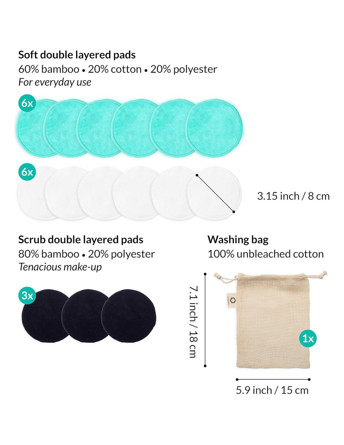 - El set incluye 3 discos de exfoliación negros y 12 discos de maquillaje suaves blancos y menta. Los discos de exfoliación son perfectos para limpiar productos a prueba de agua, mientras que los discos suaves son ideales para áreas sensibles como los ojos.