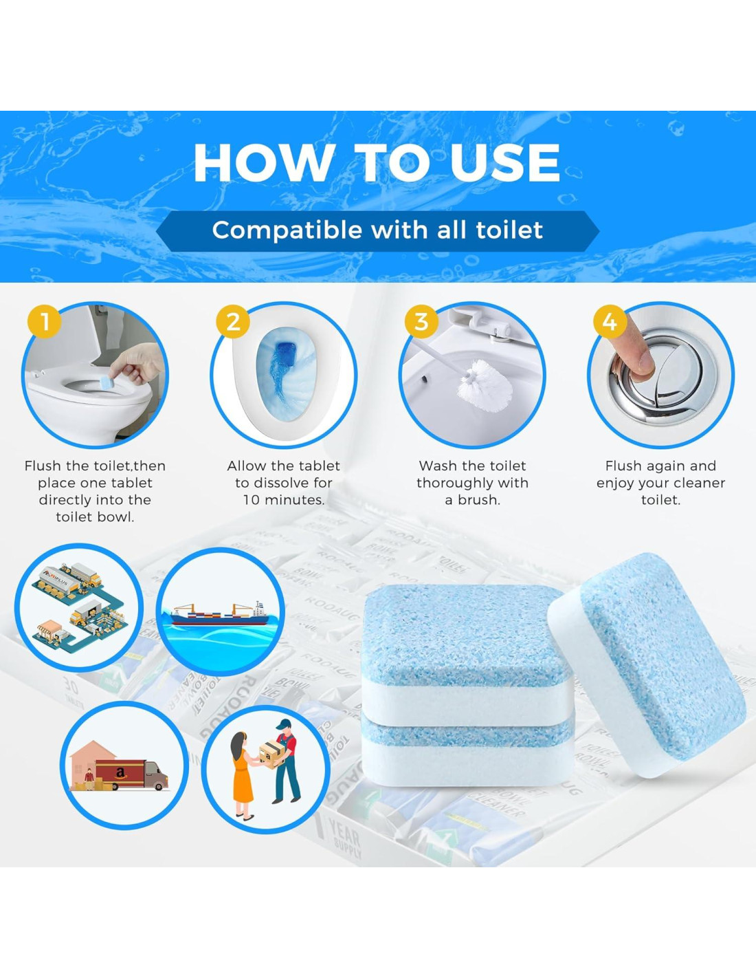: Diseñadas para una fácil colocación, las tabletas de limpieza de inodoro se pueden colocar directamente en el tanque o en la taza del inodoro, dejando que las tabletas de limpieza se disuelvan en el agua por un tiempo. Luego, use un cepillo para fregar, el efecto es mejor. Asegurando que el inodoro permanezca limpio.