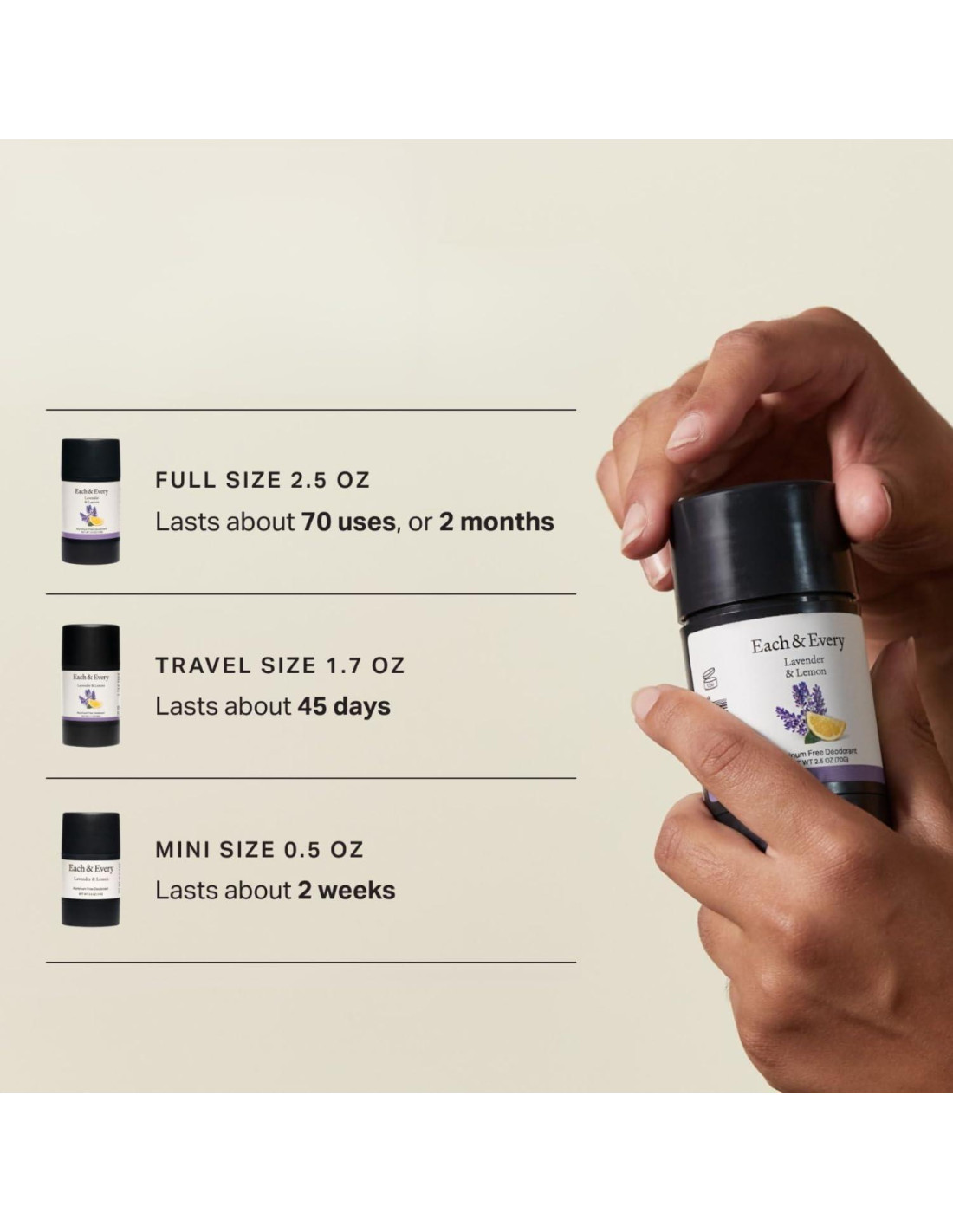 Cada Uno y Cada Uno es un desodorante libre de aluminio que mujeres y hombres pueden usar todos los días en casa, o como un desodorante de viaje cuando necesitan salir. Las fragancias como nuestro desodorante de rosa y vainilla, desodorante de limón y lavanda, o nuestro desodorante sin fragancia pueden hacer que sea difícil elegir solo uno, pero por eso hemos creado varios conjuntos de varias piezas que permiten a los usuarios probar cada aroma por sí mismos. Nuestra fórmula también lleva el desodorante de coco tradicional a otro nivel, al mezclar aceite de coco con almidón de tapioca, minerales del mar muerto y aceites esenciales para asegurar un desodorante limpio que hombres y mujeres pueden usar cada mañana. Cada lanzamiento también es libre de crueldad y vegano, y nuestro empaque sostenible está hecho de caña de azúcar. Y debido a que esta fórmula es tan suave, también puedes usarla como desodorante para niños con piel sensible, o simplemente por preferencia de ingredientes limpios y simples. Este desodorante para mujeres y hombres está hecho sin bicarbonato irritante ni alcohol, y se puede comprar en un paquete de desodorante de tamaño completo o mini para viajar. Funciona como un antitranspirante libre de aluminio para ayudar a mantenerte fresco todo el día.