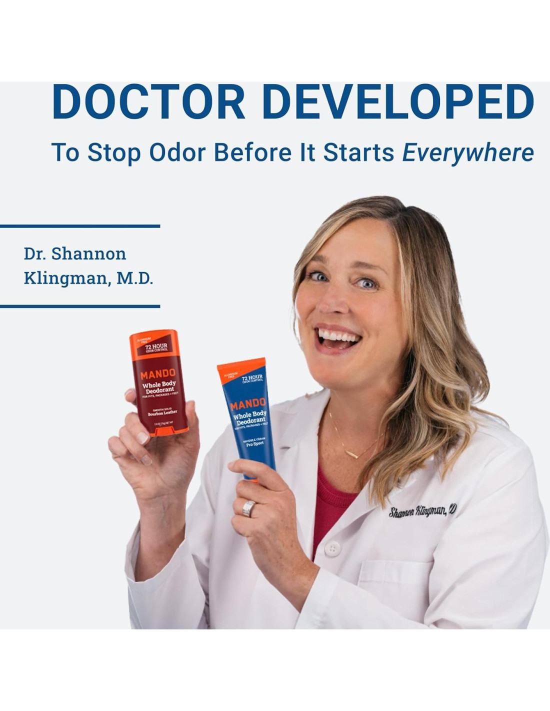 Como médico, vi cómo el mal olor socavaba la confianza de las personas. Así que pasé diez años trabajando en una solución. - Dr. Shannon Klingman, M.D. Con su poderosa tecnología acidificada, Mando Desodorante Corporal está clínicamente probado para bloquear el olor todo el día y continúa controlando el mal olor hasta por 72 horas. Ahora, los hombres en todas partes pueden mantenerse frescos, sin olores y seguros, sin importar a dónde vayan o qué hagan. Mando no solo cubre el olor como ciertos desodorantes tradicionales u otros desodorantes libres de aluminio. Mando está hecho con un ácido alfa-hidroxi innovador y suave llamado Ácido Mandélico que desactiva las bacterias responsables del mal olor, deteniendo efectivamente el olor antes de que comience. Además, puedes usar Mando en todas partes, no solo en tus axilas. Piensa en paquetes, pies, barriga y en cualquier otro lugar donde tengas olor pero desearías que no. Hombres que quieren un desodorante que realmente funcione. Mando no solo cubre el olor como ciertos otros desodorantes. Detiene el olor en la fuente. Hombres que quieren un desodorante que puedan usar en todas partes. Mando va más allá de tus axilas. Es seguro para tus axilas, paquetes, pies y más. Hombres que quieren estar sin olores todo el día. La innovadora tecnología acidificada de Mando proporciona control de olores durante todo el día, para que puedas mantenerte fresco y seguro entre duchas. Clínicamente probado para bloquear el mal olor corporal todo el día y continúa controlando el olor durante 72 horas. En lugar de cubrir el olor después de que se forma, Mando bloquea el olor antes de que comience. Un desodorante para axilas, paquetes y pies, en cualquier lugar donde tengas olor pero desearías que no. Desarrollado por un médico y seguro para la piel. Formulado sin benceno. Libre de aluminio, bicarbonato de sodio y parabenos. Mando es fabricado por el mismo equipo fundado por un médico detrás de Lume Desodorante Corporal. ¿Controla Mando Desodorante el sudor? Mando Desodorante es libre de aluminio, por lo tanto, no es un antitranspirante. Sudar es natural y necesario, pero no tiene que llevar a olores. Mientras que Mando contiene ingredientes que ayudan a absorber la humedad, no previene la transpiración. ¿Mando Desodorante mancha la ropa? No. La fórmula de Crema Desodorante de Mando es a base de agua y no deja manchas ni residuos en tu ropa. La Barra Sólida está formulada con ésteres solubles en agua y se lava con el lavado normal. ¿Es Mando Desodorante comestible? Aunque Mando es no tóxico, no se considera comestible y tiene un sabor ácido. Recomendamos aplicar una pequeña cantidad en la piel limpia y seca unas pocas veces a la semana en lugar de inmediatamente antes de la intimidad. No es necesario lavarse antes de las relaciones sexuales o sexo oral. Mini Crema Desodorante, Desodorante Sólido Suave, Crema Desodorante Invisible, Gel de Ducha Escudo de Olores, Toallitas Desodorantes, Barra Limpiadora 4 en 1. Estudios de eficacia de olores 2021 y 2022 realizados por Princeton Consumer Research.
