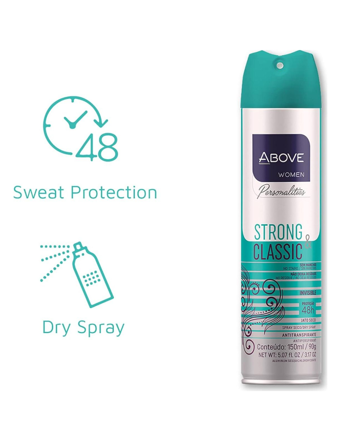 Nos esforzamos por cambiar vidas con productos naturales que encarnan la idea de que todos tienen lo que se necesita para elevarse y prosperar. Somos una empresa brasileña orgullosa dedicada a apoyar a personas como tú en mantenerse frescas y enfocadas, ya sea conquistando la sala de juntas o yendo al gimnasio. Sé audaz, sé fresca y prepárate para cada desafío con ABOVE. Manteniéndote fresca en cualquier momento y lugar. Surgimos como una empresa especializada en la fabricación de envases de aerosol y hemos hecho de nuestra misión convertirnos en una de las empresas de aerosol más grandes de Brasil, mientras mantenemos nuestra visión de ser sostenibles y centrados en la comunidad. Los productos de Above no contienen ingredientes dañinos. Son libres de triclosán, libres de crueldad y 100 por ciento naturales, mientras proporcionan alta hidratación. Nos encanta apoyar a las comunidades locales, buscamos apoyar la innovación y enfatizar la importancia de la honestidad, la educación y el respeto para todos. Presentamos ABOVE Fuerte y Clásico - Desodorante Antitranspirante para Mujeres de 48 Horas Personalidades, el epítome de la fuerza y la elegancia atemporal. Diseñado para empoderar y abrazar tu individualidad, esta poderosa fórmula proporciona 48 horas de protección confiable contra la transpiración y el olor. Abraza tu fuerza interior y emana un atractivo atemporal con ABOVE Fuerte y Clásico. Cuidadosamente elaborado, nuestro desodorante antitranspirante combina una audaz mezcla de fragancias vigorizantes, creando un aura de confianza que dura todo el día. Ya sea que estés conquistando la sala de juntas o disfrutando de una noche en la ciudad, mantente fresca y serena con ABOVE. Experimenta la eficacia inquebrantable de ABOVE Fuerte y Clásico. Nuestra fórmula probada por dermatólogos asegura que siempre estés al mando, proporcionando frescura y protección duraderas. No te conformes con lo ordinario; elige ABOVE y desbloquea tu potencial ilimitado. Necesitas protección durante el día, y tenemos más que eso. Above Feel Free te mantendrá fresca todo el día con hasta 48 horas de protección. Creemos que cuidarse a uno mismo no debería ser complicado, así que mantenemos nuestros productos. No importa el color de la ropa, Above Feel Free no dejará manchas en tu apariencia. Debes estar protegida y lucir genial. Punto.