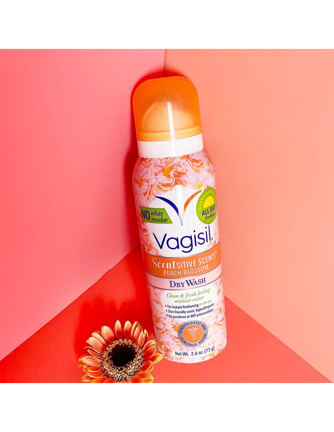 - Incluye un envase de 73.71 gramos de spray de lavado seco femenino Scentsitive Scents de Flor de Durazno de Vagisil
