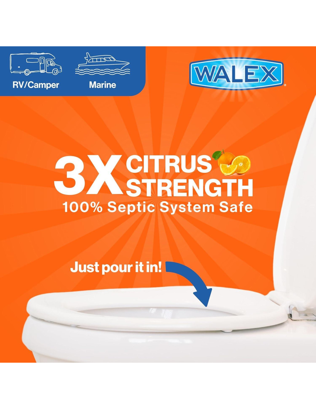 ¿Cansado de luchar contra olores desagradables y de lidiar con tanques negros obstruidos? No busques más, Citra-Fresh líquido desodorante para tanques de sostenimiento de RV y marina es tu solución definitiva para una experiencia de RV o marina impecable. Citra-Fresh líquido desodorante para inodoros de RV y marina es el limpiador de inodoros marinos definitivo, desodorante para tanques de campers, desodorante para inodoros portátiles y desodorante para tanques negros para RVs y barcos. Nuestra poderosa fórmula no solo controla los olores, sino que también descompone eficientemente el papel y los desechos. Nuestro innovador líquido está diseñado para tu conveniencia. Simplemente échalo y el limpiador de inodoros Citra-Fresh para RV y barco comienza a trabajar de inmediato sin derrames desordenados. El uso continuo ayuda a que las tuberías, válvulas y sellos funcionen sin problemas. Experimenta la delicia de una fragancia cítrica refrescante que transforma tu espacio. El líquido para tanques negros de Citra-Fresh para marina y RV es responsable con el medio ambiente. Nuestra fórmula segura para sistemas sépticos se descompone de manera natural y es amigable con los campamentos. No dejes que los olores desagradables y los atascos arruinen tu viaje. Mejora tu RV o barco con el desodorante líquido para tanques de aguas negras Walex Citra-Fresh. Toma el control de tu tanque, elimina olores y disfruta al máximo del aire libre.