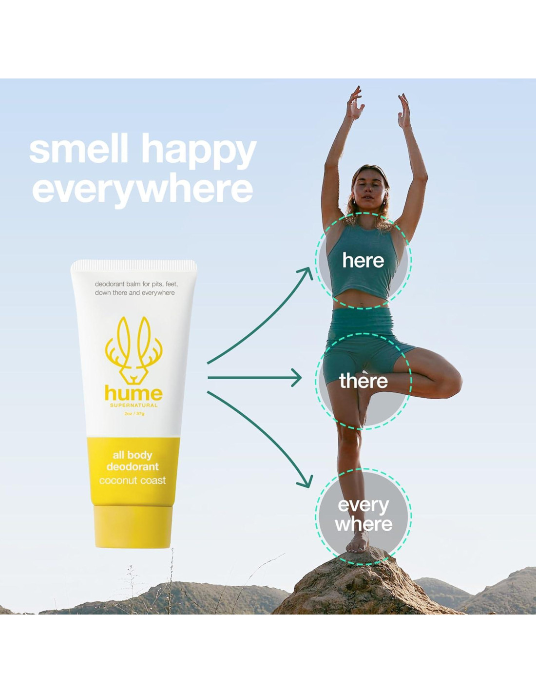 Abraza la frescura de la naturaleza con nuestro nuevo desodorante para todo el cuerpo. Desde las axilas hasta los pies, es un bálsamo premium a base de plantas para todos los humanos. Todo el día, todos los días - ¡La fórmula impulsada por plantas de Hume ofrece una defensa inigualable contra los olores en todo el cuerpo! Transforma tu rutina diaria con los productos de Hume. Nuestro compromiso con la salud y la felicidad se refleja en nuestras fórmulas que atienden todos los tipos de piel, aprovechando el poder de las plantas del desierto. Siempre a base de plantas y minerales, no tóxicos y libres de crueldad, nuestros productos te permiten oler feliz y sentirte seguro todo el día. Di adiós a los ingredientes dañinos y a las pruebas en animales, y hola a una experiencia sobrenatural. Elaborados sin toxinas y sin aluminio, los desodorantes Hume son una elección segura y saludable. Huele feliz y siéntete seguro todo el día sin comprometer la salud. Revive la piel resistente con los aceites a base de plantas de Hume. Respaldado por la ciencia, nutre la piel con una fórmula rica en nutrientes y aprobada por el microbioma. ¡El escudo definitivo contra los olores! Transforma tu ritual diario con Hume Supernatural, un desodorante revolucionario para todo el cuerpo tanto para hombres como para mujeres. Meticulosamente elaborado, asegura frescura total y confianza desde las axilas hasta los pies, y cada rincón entre ellos. Redefine tu higiene con un enfoque holístico, asegurando que te mantengas revitalizado y seguro de ti mismo. ¡Abraza el poder transformador para una experiencia diaria vigorizante! Nuestra fórmula clara combina tres potentes super-absorbedores - Tierra de Diatomeas, Almidón de Tapioca y Caolín - asegurando sequedad y protección contra olores durante todo el día sin residuos en la ropa. A medida que estos super-absorbedores absorben rápidamente la humedad, tus axilas se mantienen frescas y limpias. Enriquecido con elementos que aman la piel como la Pera Espinosa, Aloe, Flor de Cactus y Coco, nuestro desodorante a base de plantas ofrece más que solo protección. La Pera Espinosa proporciona antioxidantes y fitonutrientes, nutriendo y protegiendo tu delicada piel de las axilas. El Aloe y la Flor de Cactus ofrecen hidratación calmante, mientras que el Coco aporta una fragancia refrescante. Hume Supernatural asegura que tu piel reciba el mismo nivel de cuidado que el resto de tu cuerpo. Descubre la confianza con Hume Supernatural - libre de aluminio y bicarbonato de sodio, asegurando que no haya residuos ni manchas en la ropa. Extendiendo su cuidado, atiende las necesidades de tu cuerpo, asegurando frescura y confianza. Con propiedades anti-rozaduras que combaten problemas como picazón y erupciones, Hume Supernatural está infusionado con elementos prebióticos para nutrir un microbioma cutáneo equilibrado. Empleando la ciencia para prevenir proactivamente los olores, se erige como un verdadero guardián de tu mejor yo. Sumérgete en la frescura de nuestra formulación sin fragancia, ideal para mostrar tu esencia natural o usar tus perfumes favoritos sin interferencias. Di adiós a los olores no deseados, desde zapatos malolientes hasta axilas sudorosas y áreas íntimas. Eleva tu cuidado corporal con el bálsamo desodorante Hume Supernatural para todo el cuerpo, ofreciendo frescura superior y excelente protección contra la fricción por rozaduras. No te conformes con menos - elige Hume Supernatural y dale a tus axilas el amor que merecen. ¿Por qué son mejores los desodorantes Hume Supernatural? La mayoría de los desodorantes simplemente intentan cubrir el olor. ¡No es de extrañar que no funcionen! Creamos un mejor producto con un enfoque más inteligente y multifacético que aborda todas las causas del mal olor, mientras promueve una piel más saludable. ¿Cómo funcionan los desodorantes Hume Supernatural? Te mantiene seco con super-absorbedores, previene olores con desodorantes derivados de probióticos y nutre la piel con flora natural del desierto como la Pera Espinosa, que prospera en entornos extremos. ¿Es seguro el desodorante para todo el cuerpo para pieles sensibles? Sí, es seguro para todos los tipos. Fórmula premium, aprobada por el microbioma para todos los humanos. Libre de aluminio, libre de bicarbonato de sodio, libre de AHA/BHA, libre de parabenos, libre de ftalatos, libre de talco y libre de crueldad. ¿Ayuda el desodorante para todo el cuerpo con las rozaduras? Sí. Aplica en los muslos internos o en cualquier lugar donde la piel toque la piel para reducir las rozaduras. hume representa a ti, a mí y a todos los humanos en la búsqueda de vivir sobrenatural. Bálsamo desodorante para todo el cuerpo. Barra de desodorante. Spray de aceite corporal seco. Todo el cuerpo. Protección contra olores de larga duración hecha para todas las partes del cuerpo con beneficios anti-rozaduras. Axilas. Optimizado para axilas, absorbiendo la humedad y neutralizando olores todo el día. Todo el cuerpo. Rápidamente absorbido, nuestra fina bruma de aceite deja todos los tipos de piel con un brillo saludable. Ingredientes limpios. Fórmula a base de plantas, libre de aluminio, libre de bicarbonato de sodio y aprobada por el microbioma. Ingredientes limpios. Fórmula a base de plantas, libre de aluminio, libre de bicarbonato de sodio y aprobada por el microbioma. Ingredientes limpios. A base de plantas, rica en nutrientes y aprobada por el microbioma. Seguro para pieles sensibles. Sí. Seguro para pieles sensibles. Sí. Seguro para pieles sensibles. Sí.