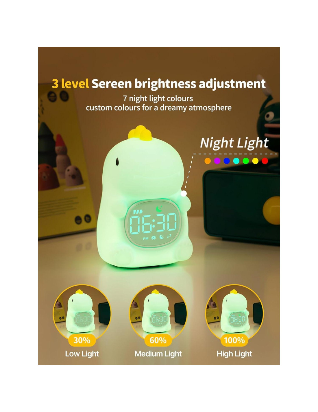 - Magia de la mañana adecuada para todas las edades Imagina despertar con luces suaves danzando en la habitación de tu hijo, acompañadas de suaves melodías naturales, reemplazando el fuerte sonido del despertador. Nuestro adorable reloj de dinosaurio verde utiliza características de despertador sensorial dual: luces coloridas que se iluminan gradualmente + tonos de alarma personalizables (¡con 6 opciones!) para ayudar incluso a los dragones más gruñones (¡o adultos!) a comenzar su día con una sonrisa.