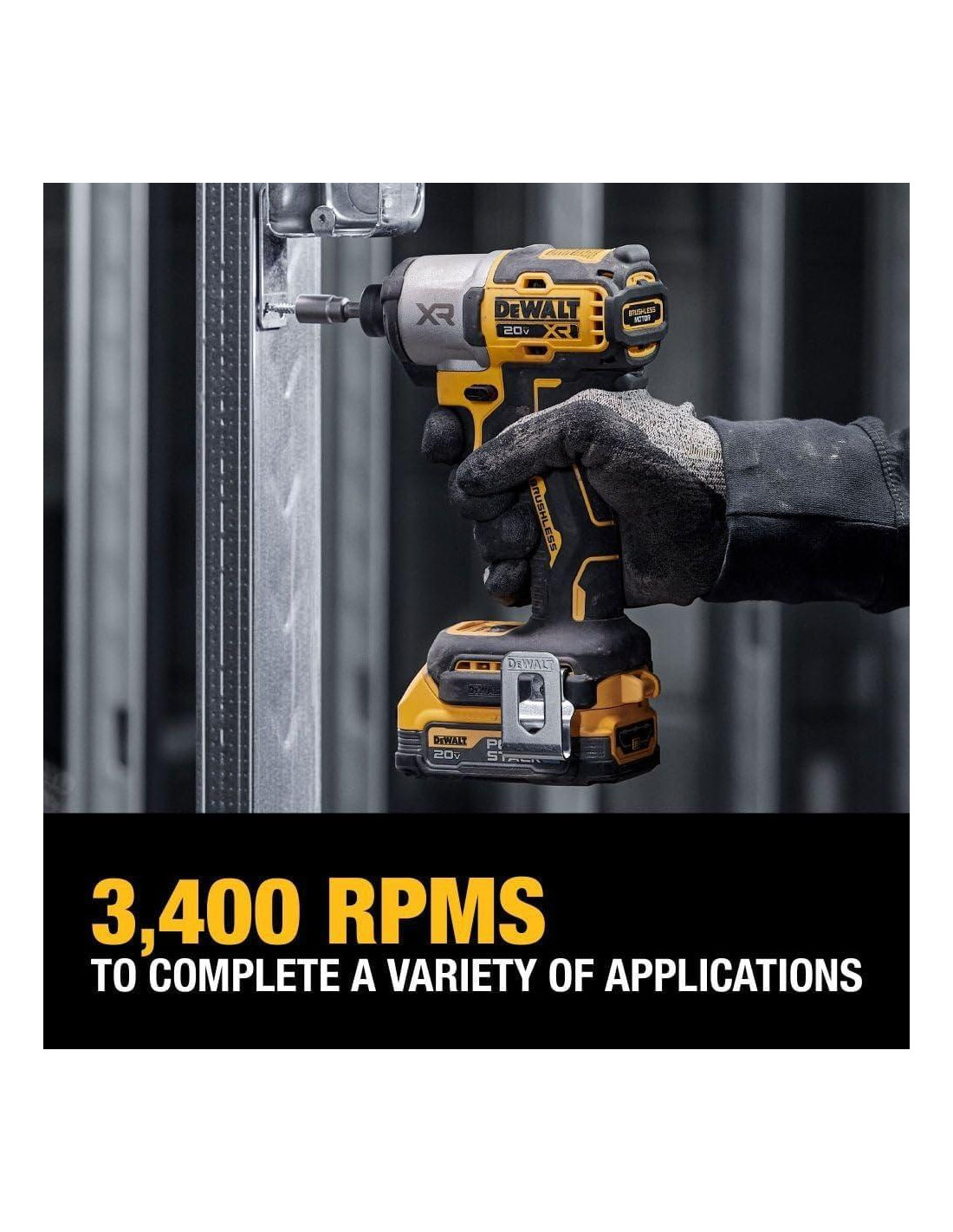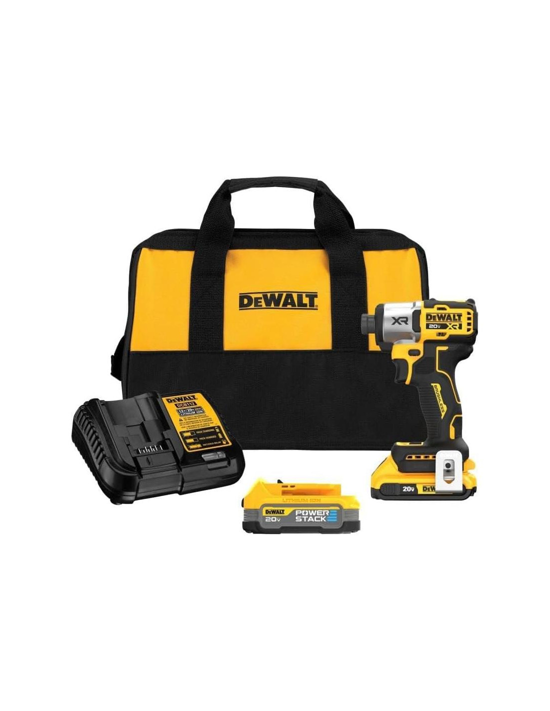 - Componentes incluidos: DCF845 20V MAX* XR 1/4 in. 3-Speed Destornillador de Impacto; DCBP034 20V MAX* DEWALT POWERSTACK Batería Compacta; DCB203 20V MAX* Batería de 2Ah; Gancho para cinturón; Cargador; Bolsa de kit