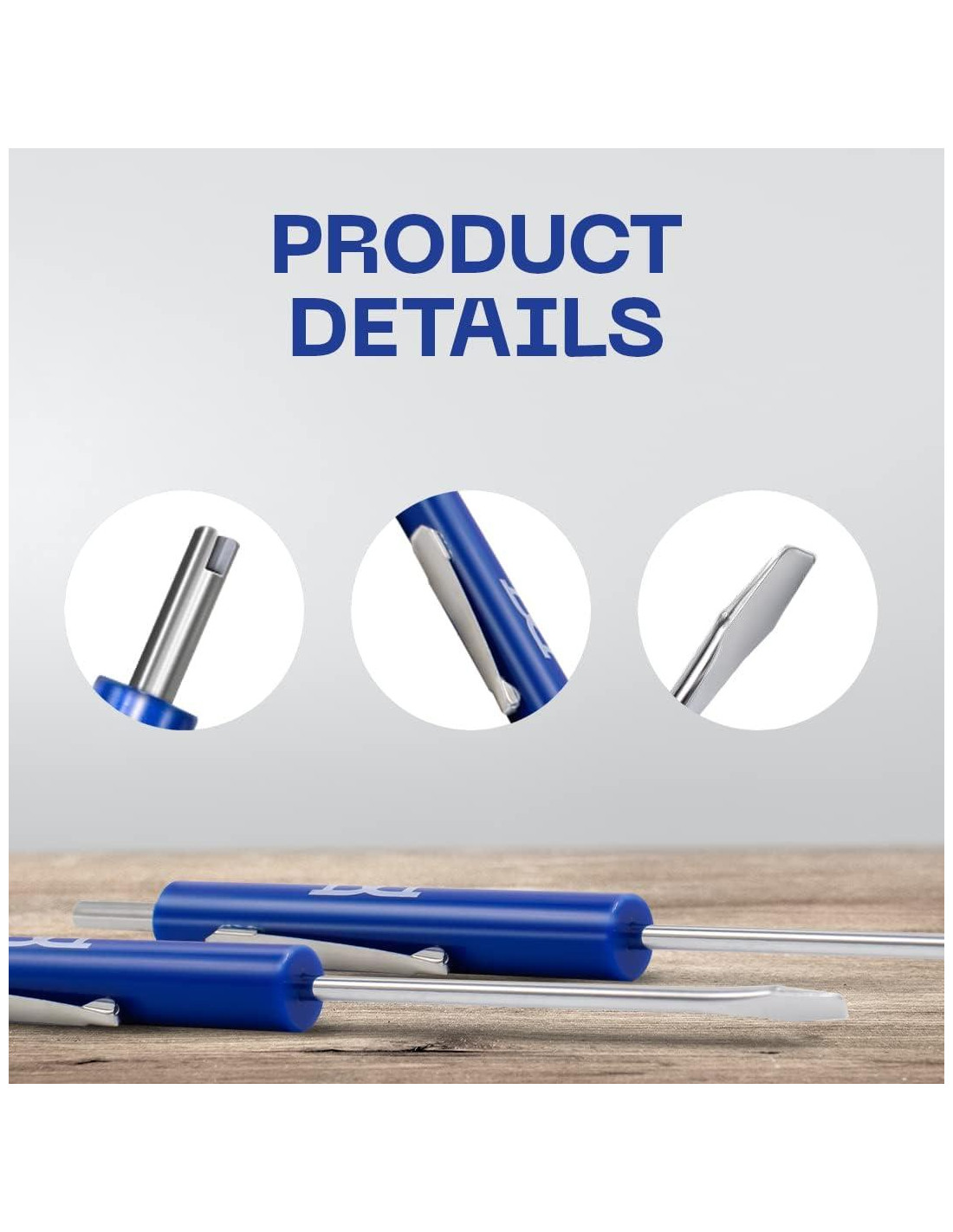 - Trío de destornilladores de bolsillo - Este mini destornillador eléctrico es más que una herramienta, es un dispositivo de doble propósito con una cabeza plana de 0.13" (0,33 cm) en un extremo y un removedor de núcleo de válvula Schrader en el otro. Es el destornillador de bolsillo magnético definitivo, diseñado para engancharse a tu ropa para un acceso continuo