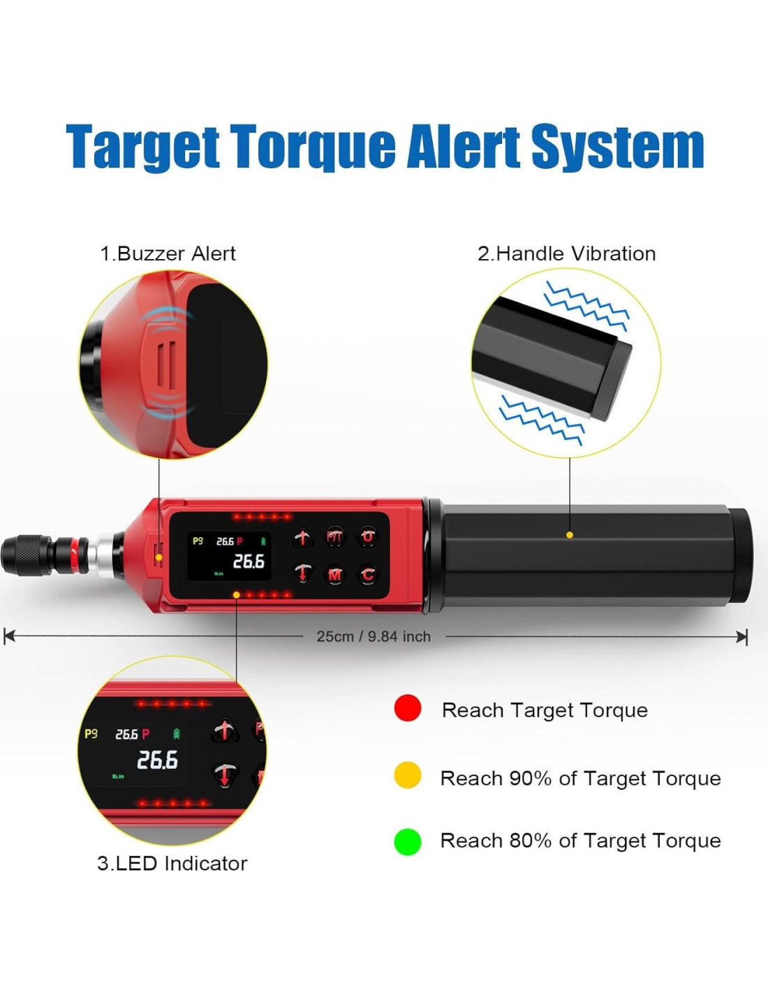 - [Sistema de Advertencia Mejorado] El mango del destornillador de par está equipado con un motor de vibración, al usar el destornillador de par cerca del valor preestablecido habrá una vibración significativa en el mango, el indicador LED y el buzzer también te darán retroalimentación, recordándote que detengas la aplicación de fuerza, es muy adecuado para trabajar en entornos oscuros y ruidosos.