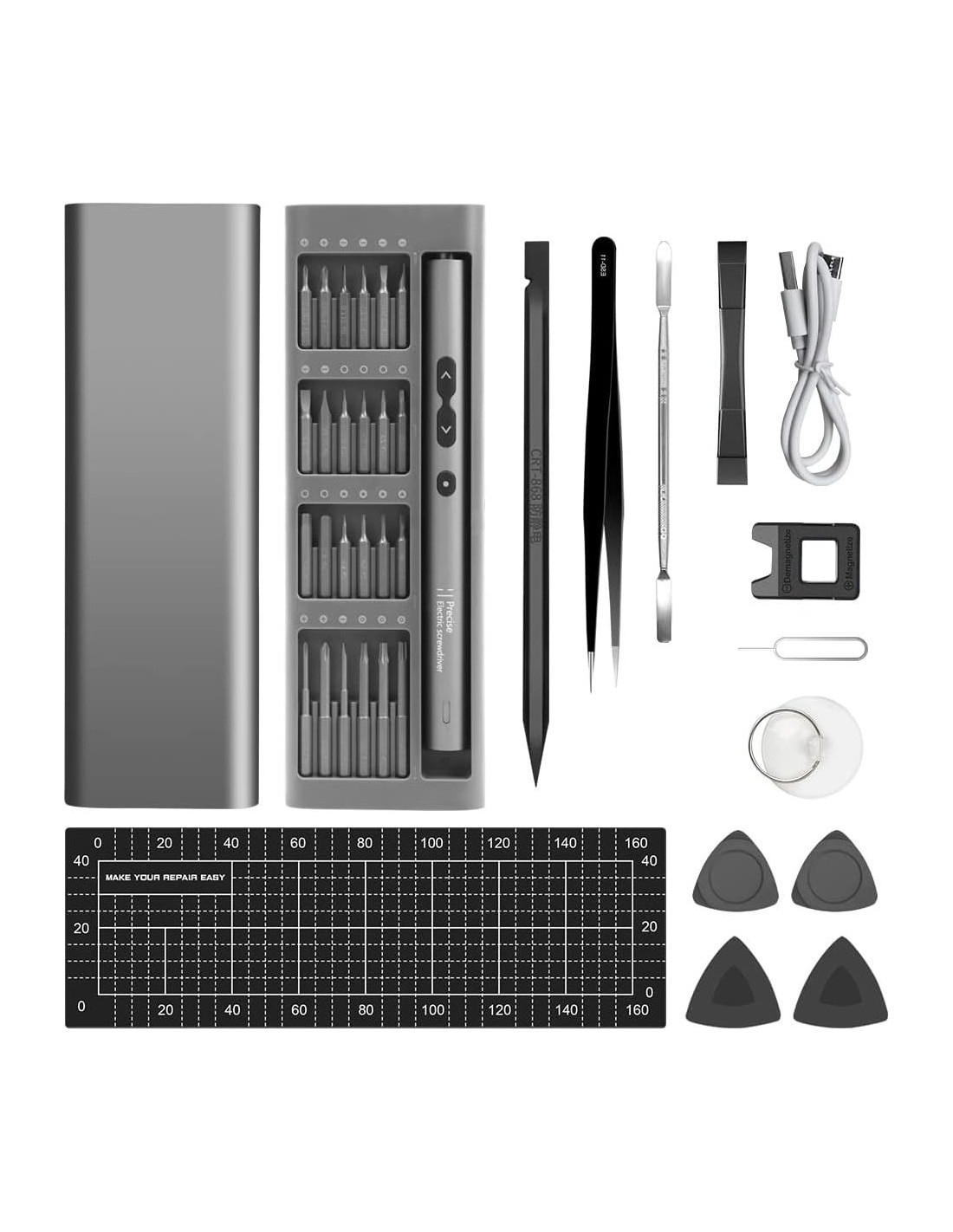 - Este destornillador de potencia incluye 48 puntas de precisión, Almohadilla de Trabajo Magnética, Ventosa, Palanca, Pinzas, etc. Adecuado para relojes de cuarzo, cámaras digitales, radios, tabletas, teléfonos celulares, drones, joystick, laptop, iPhone, gafas, Macbook, Xbox y juguetes, muebles, etc.