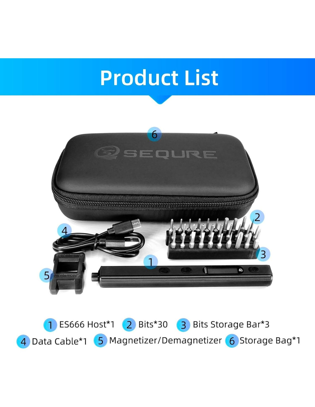 - Componentes incluidos: Anfitrión de destornillador ES666 x 1, herramienta magnetizada y desmagnetizada x 1, bolsa de almacenamiento x 1, cable de datos x 1, puntas magnéticas S2 x 30