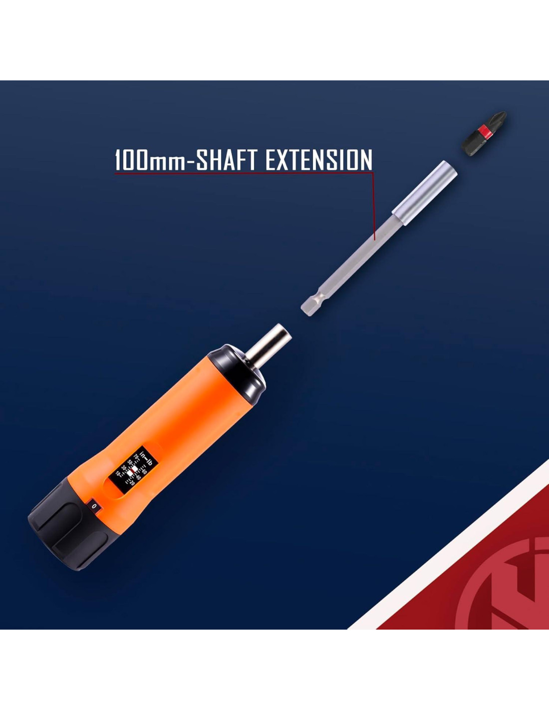 - Conjunto Compacto: nuestro conjunto de destornillador de par de 1/4" incluye el destornillador de par, 5 puntas Phillips, 5 puntas Pozidriv, 5 puntas ranuradas, 5 puntas hexagonales, 10 puntas Trox, 6 puntas hexagonales métricas, 4 puntas cuadradas, 1 extensión de eje de 100mm, 1 mango en T, y 1 enchufe de 1/4".