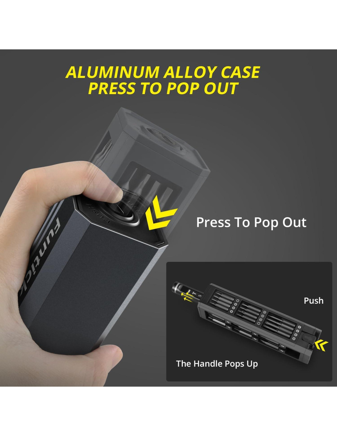 - Qué hay en la caja: 1 destornillador eléctrico mini, 1 caja de almacenamiento, 2 cajas de almacenamiento de cabezales de destornillador portátiles (16 puntas de precisión), 42 puntas de precisión (todas las puntas mostradas), 1 pinza, 1 palanca, cable de carga USB Type-C, 1 manual del usuario
