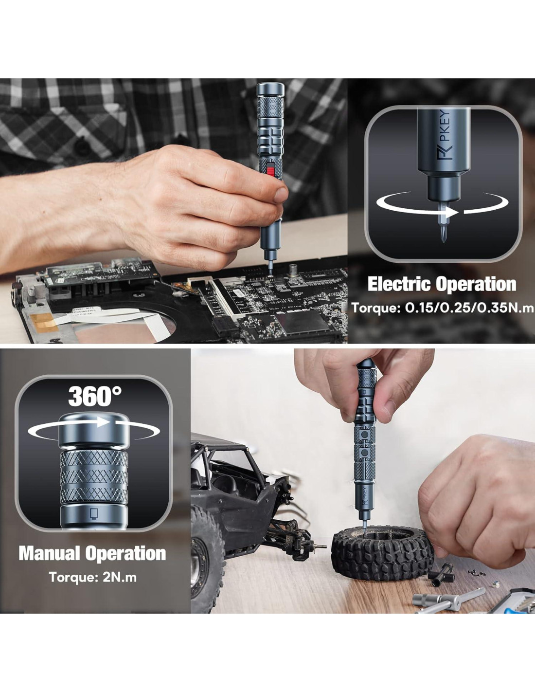 - [3 Velocidades Ajustables y Protección contra Sobrecarga] El destornillador eléctrico PKEY está equipado con modo eléctrico de 3 niveles (par: 0.15N.m/0.25N.m/0.35N.m), y la velocidad sin carga es de 180/190/200rpm. Es una opción ideal para reparar electrónicos como laptops, teléfonos móviles, cámaras, relojes, controladores, lámparas de escritorio, drones, consolas de juegos, etc. Este destornillador eléctrico no dañará tu equipo porque detecta automáticamente el límite de par y se apaga.
