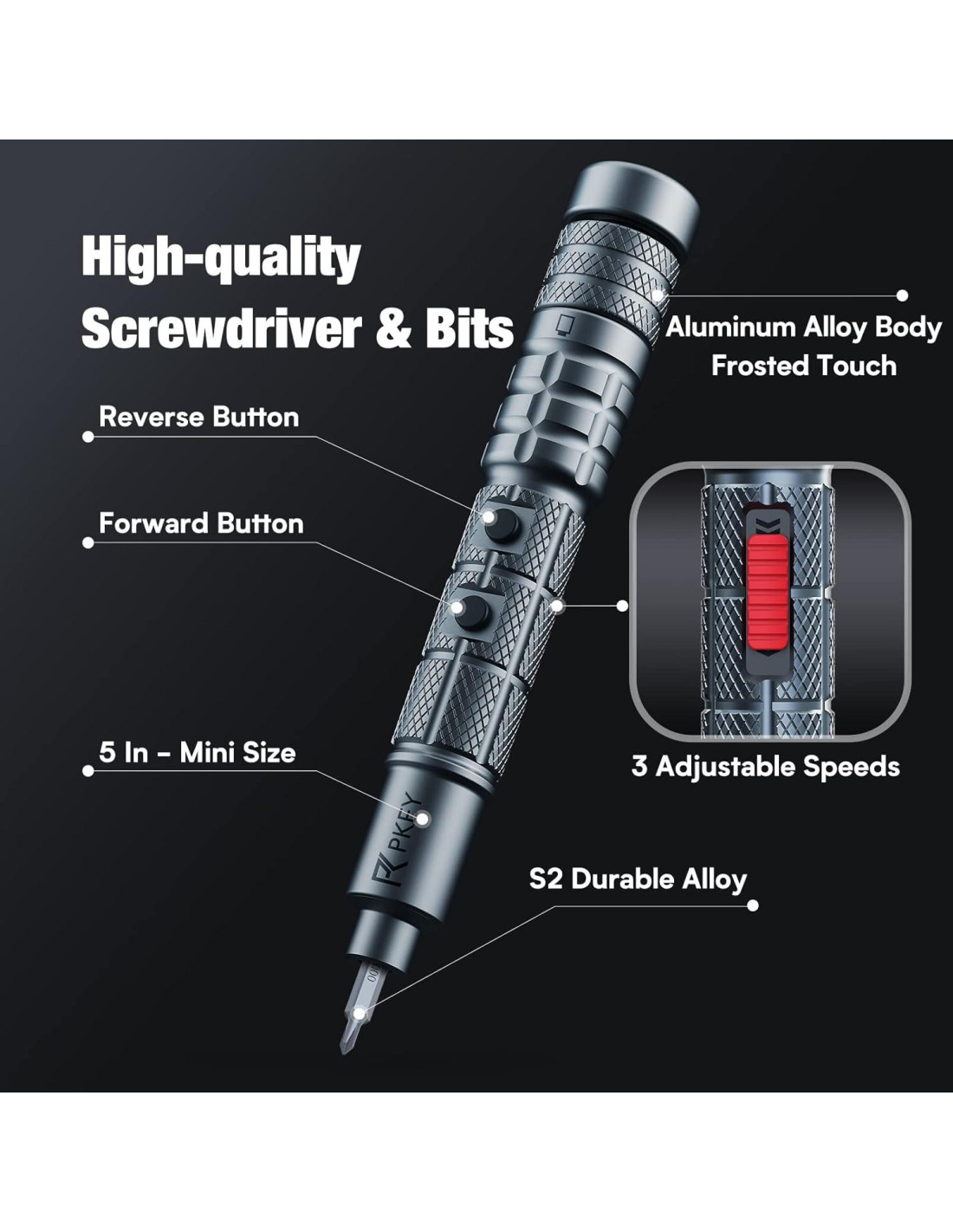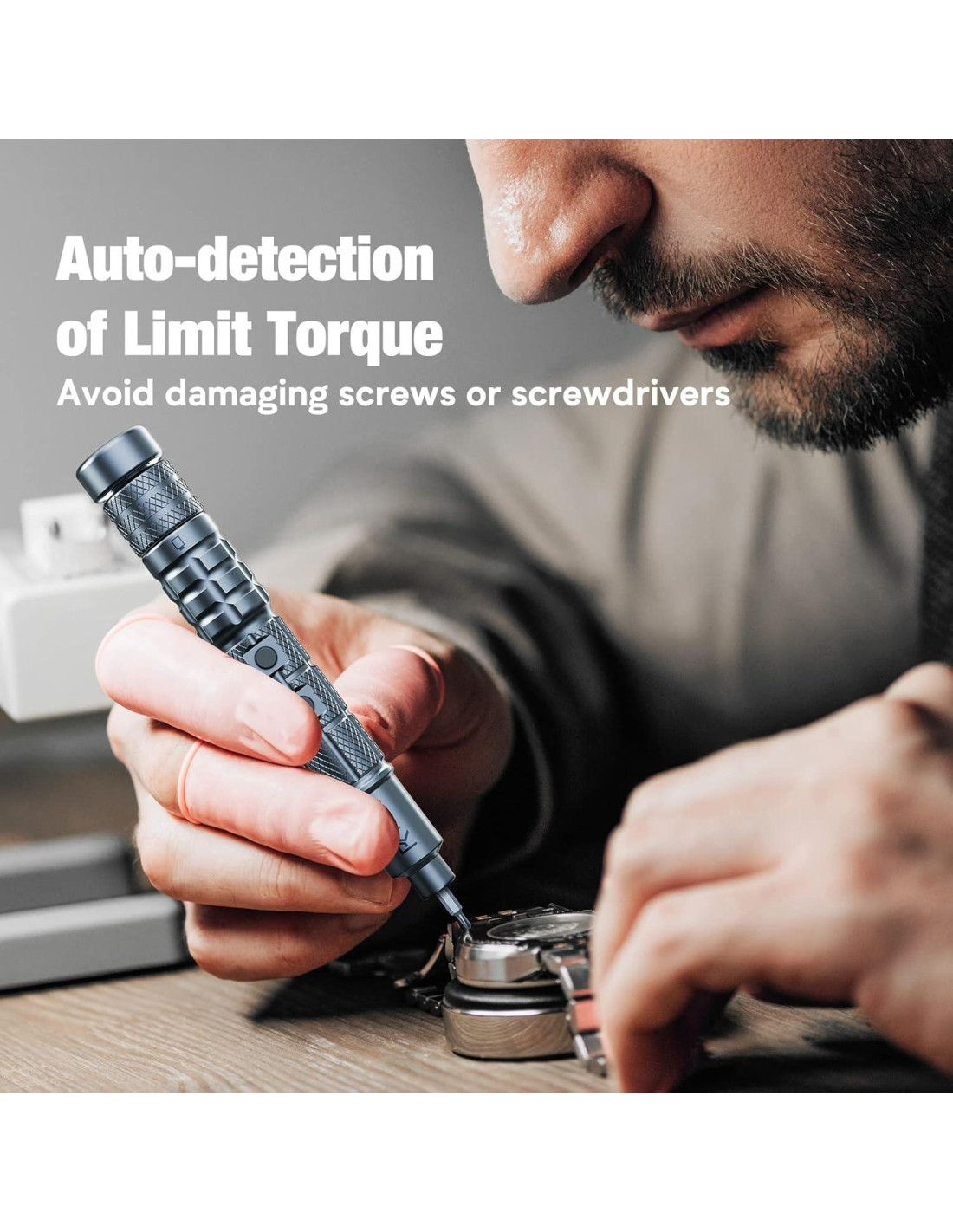 - [Cuerpo de Aleación de Aluminio Ultra Corto] El destornillador eléctrico pequeño diseñado ergonómicamente tiene solo 5 pulgadas (12.7 cm) de longitud, lo que permite que sea fácil de sostener, y puedes agarrar los destornilladores de manera horizontal como conveniencia. El cuerpo de aleación de aluminio de alta calidad y el tacto mate te hacen disfrutar de la reparación. El exterior gris oscuro del destornillador inalámbrico brinda una experiencia visual premium. Este juego de destornilladores de precisión de alta gama es un regalo perfecto para las personas que aman los equipos electrónicos.