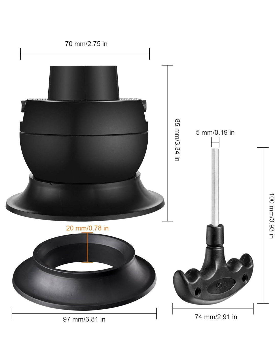 - Producto: Tornillo de bola. Color: Negro Mate. Material: Acero inoxidable. Diámetro de la bola: 78mm (3 pulgadas). Altura: 85 mm (3.34 pulgadas). Apertura máxima: 53 mm (2.13 pulgadas). Diámetro de la base: 98 mm (3.85 pulgadas)