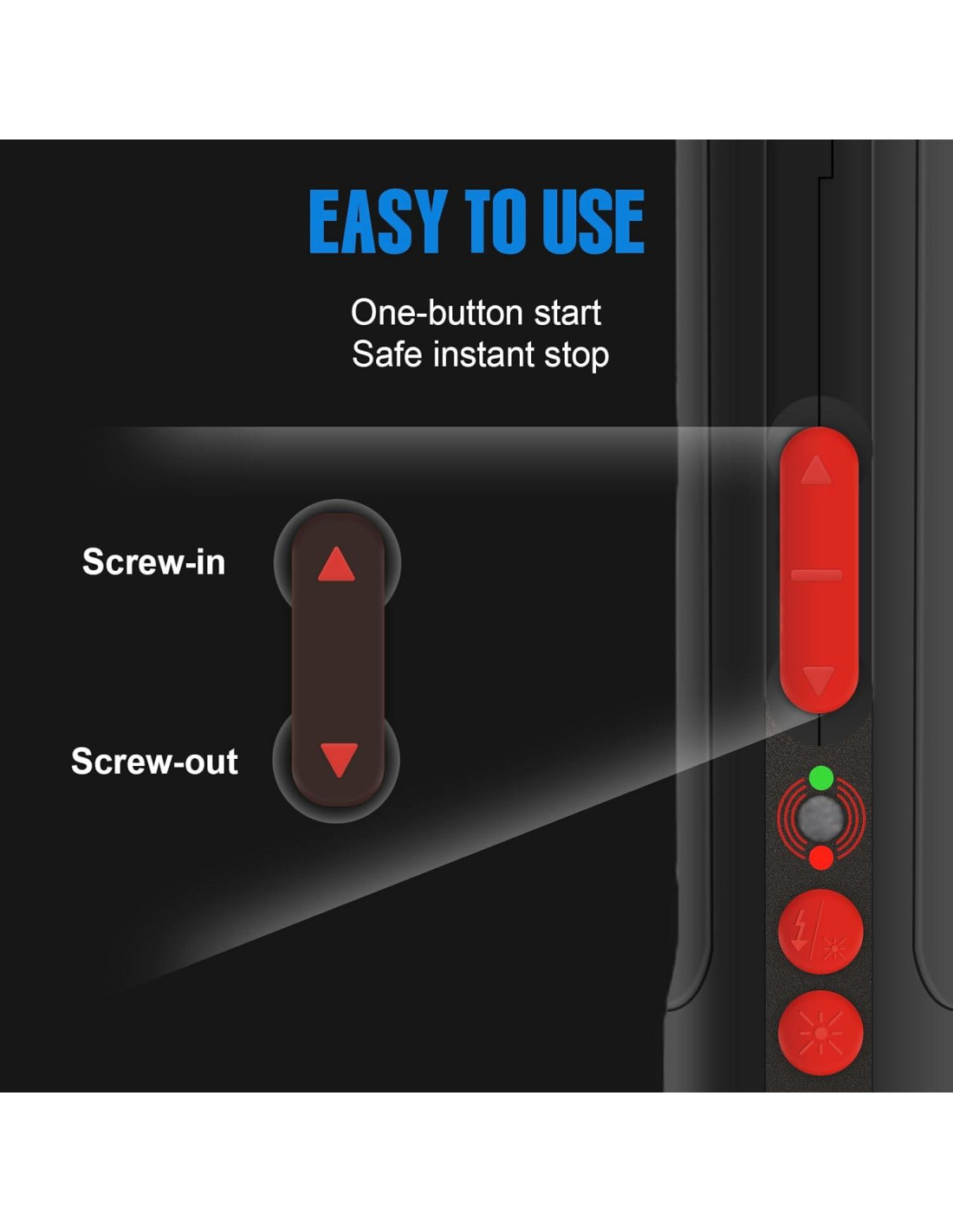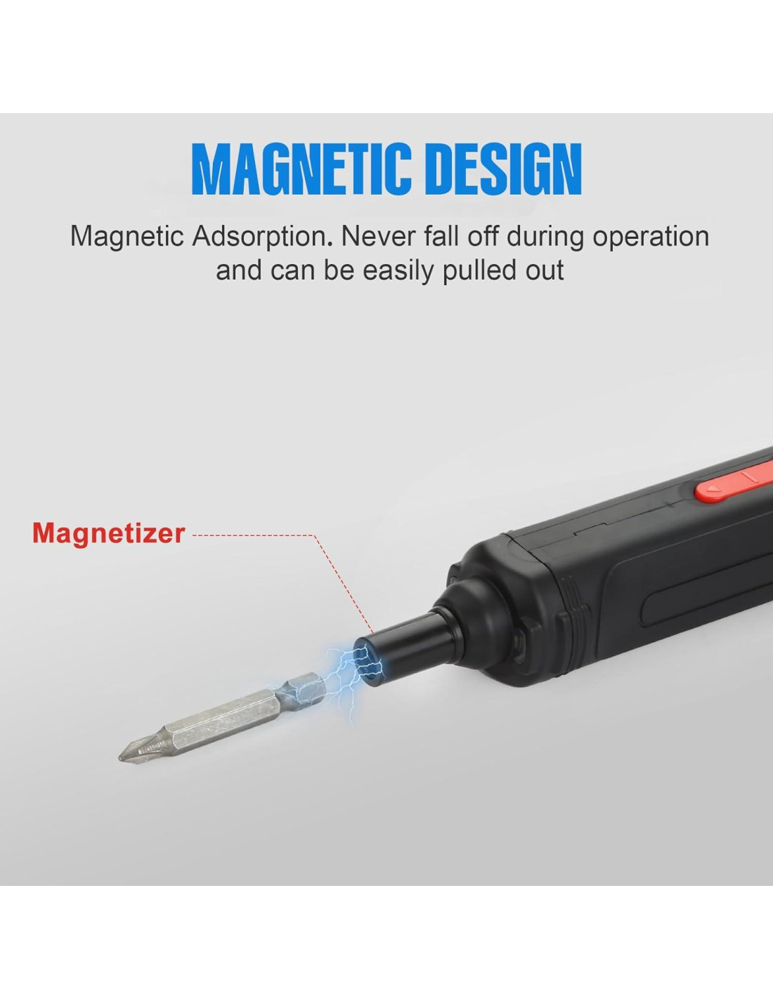 - LUZ DE TRABAJO LED Y LINTERNA - Cuando el destornillador se enciende, la luz LED se ilumina automáticamente, facilitando la visibilidad en áreas poco iluminadas. Se apagará automáticamente después de unos segundos de inactividad para ahorrar energía. También hemos diseñado una linterna en el extremo del destornillador. Simplemente presiona el botón para encenderla en caso de emergencia.
