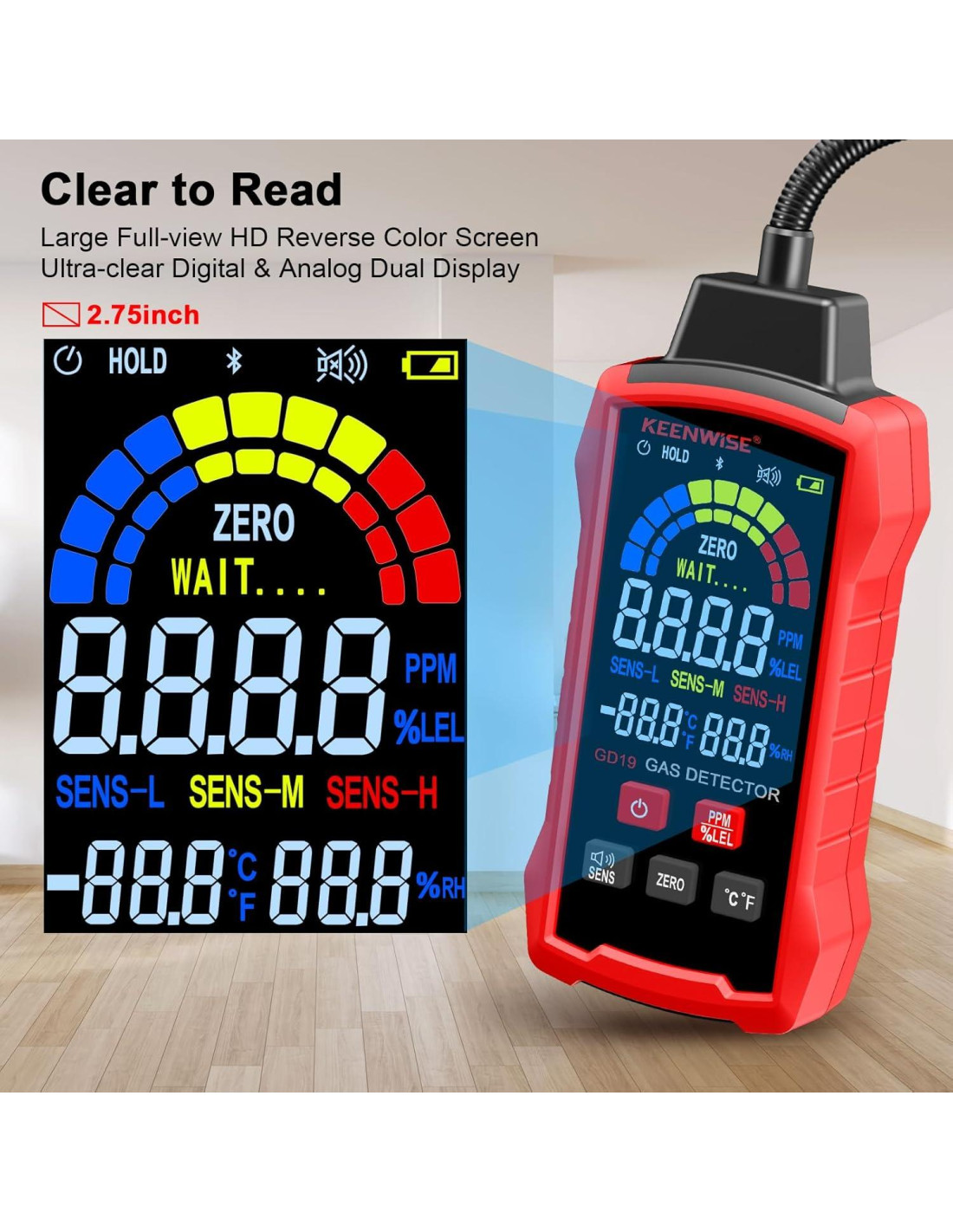 - Detector de Fugas de Gas Combustible: El detector de gas GD19 puede detectar rápida y precisamente fugas de gas en áreas de difícil acceso como metano, propano, gas natural y gas licuado de petróleo. Es altamente sensible incluso a fugas menores, lo que le permite localizar con precisión posibles fugas de gas en el hogar o en una caravana. Nota: Por favor, permita 30 segundos para el precalentamiento antes de la operación.
