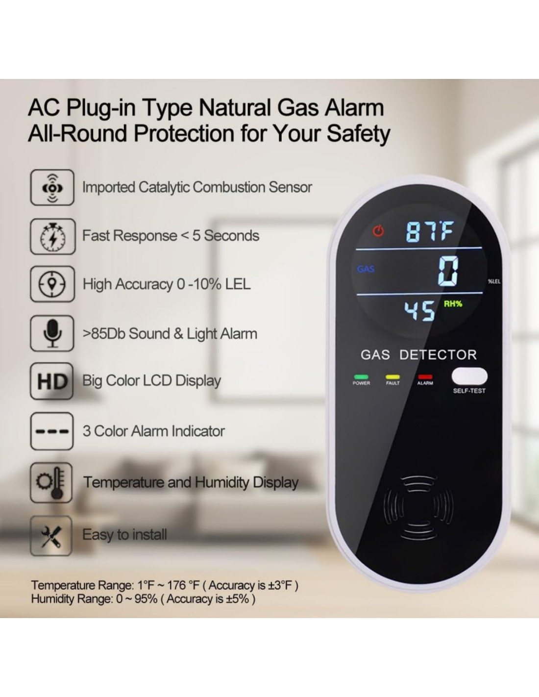 - Recientemente Mejorado 3-en-1: El detector de gas combustible no solo monitorea la concentración de gas, sino que también muestra la temperatura y la humedad del entorno circundante, lo que lo hace conveniente y ahorra espacio.