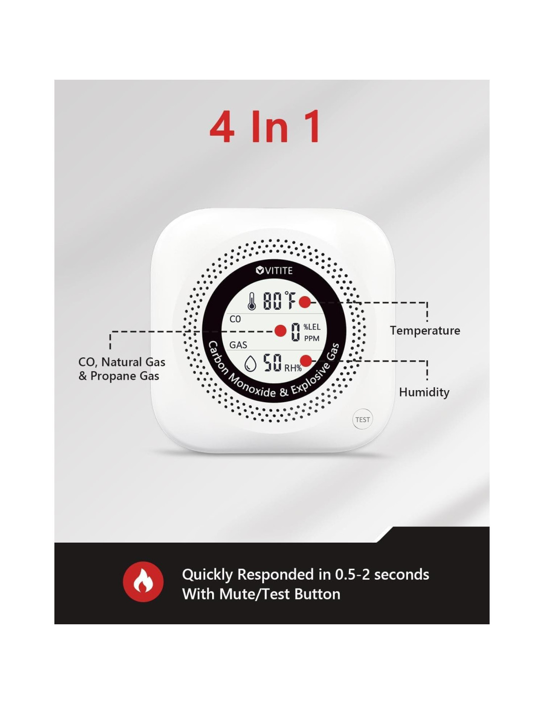 - Alertas Sonoras y de Pantalla: El detector emite advertencias tempranas con una alarma de 85dB y una pantalla LCD (alarma de CO: >150PPM, alarma de gas: >5%LEL). Puedes probar su rendimiento y activar la pantalla con el botón de prueba
