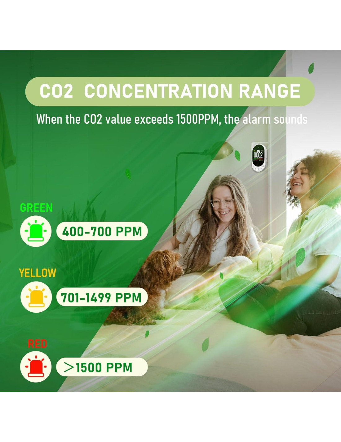 - Función de Alarma de CO2: Una alarma suena automáticamente cuando el CO2 supera 1500 PPM, con rangos de alarma personalizables disponibles. Recibe alertas inmediatas cuando los niveles de CO2 superan tus umbrales establecidos, asegurando conciencia en dormitorios, guarderías, bodegas, sótanos y otros espacios.