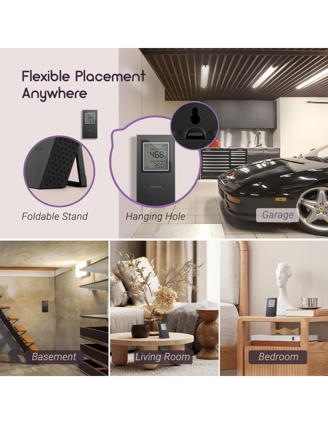 - Colocación flexible: Podemos colocar este detector de radón para el hogar, en una superficie plana con su soporte plegable o colgarlo en la pared a través del agujero de colgar en su parte posterior. Es ideal para cualquier lugar cerca del suelo, como un garaje, sótano, bodega y sala de estar, monitoreando continuamente el nivel de radón en la casa.