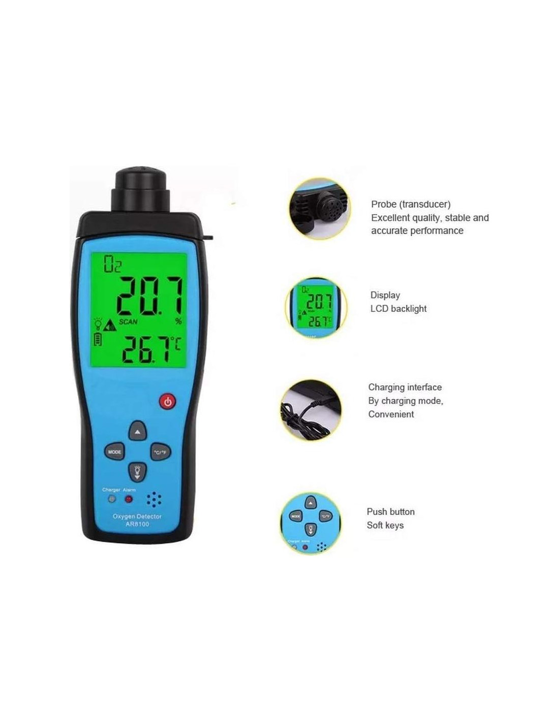 - FUNCIÓN PODEROSA: Alarma acústica y visual cuando la concentración de gas O2 alcanza el nivel de alarma. Con una gran pantalla LCD que muestra los resultados medidos, puedes obtener la concentración de gas y la temperatura de un vistazo.