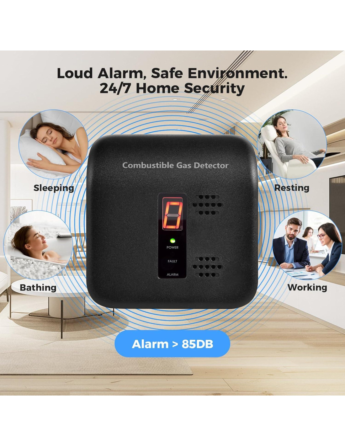 - Alta Sensibilidad con Pantalla LED en Tiempo Real - Cuenta con un sensor avanzado que proporciona detección instantánea de fugas de gas y muestra el nivel de concentración en la pantalla LED con una alarma de 85dB para advertencia temprana.