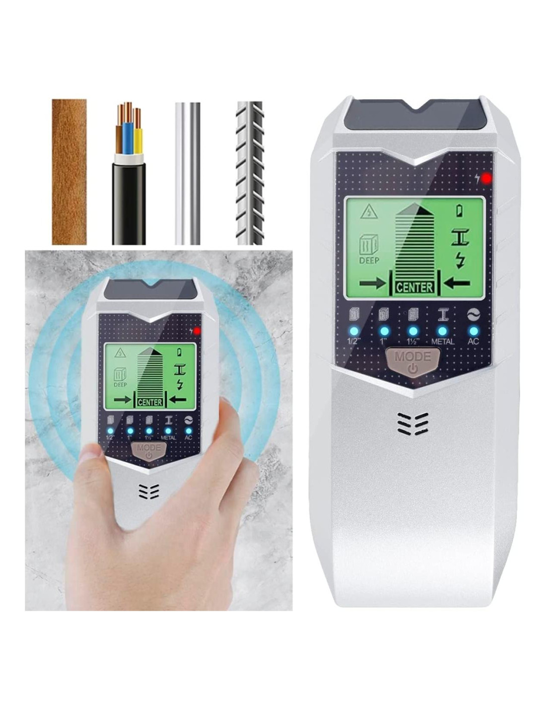 - Diseño 5 en 1 Este sensor de buscador de estudio tiene un diseño 5 en 1, que puede proporcionar más necesidades de detección. Localiza rápida y fácilmente montantes de madera y metal, vigas, tuberías de metal, varilla y cables AC vivos detrás de paredes, pisos y techos.