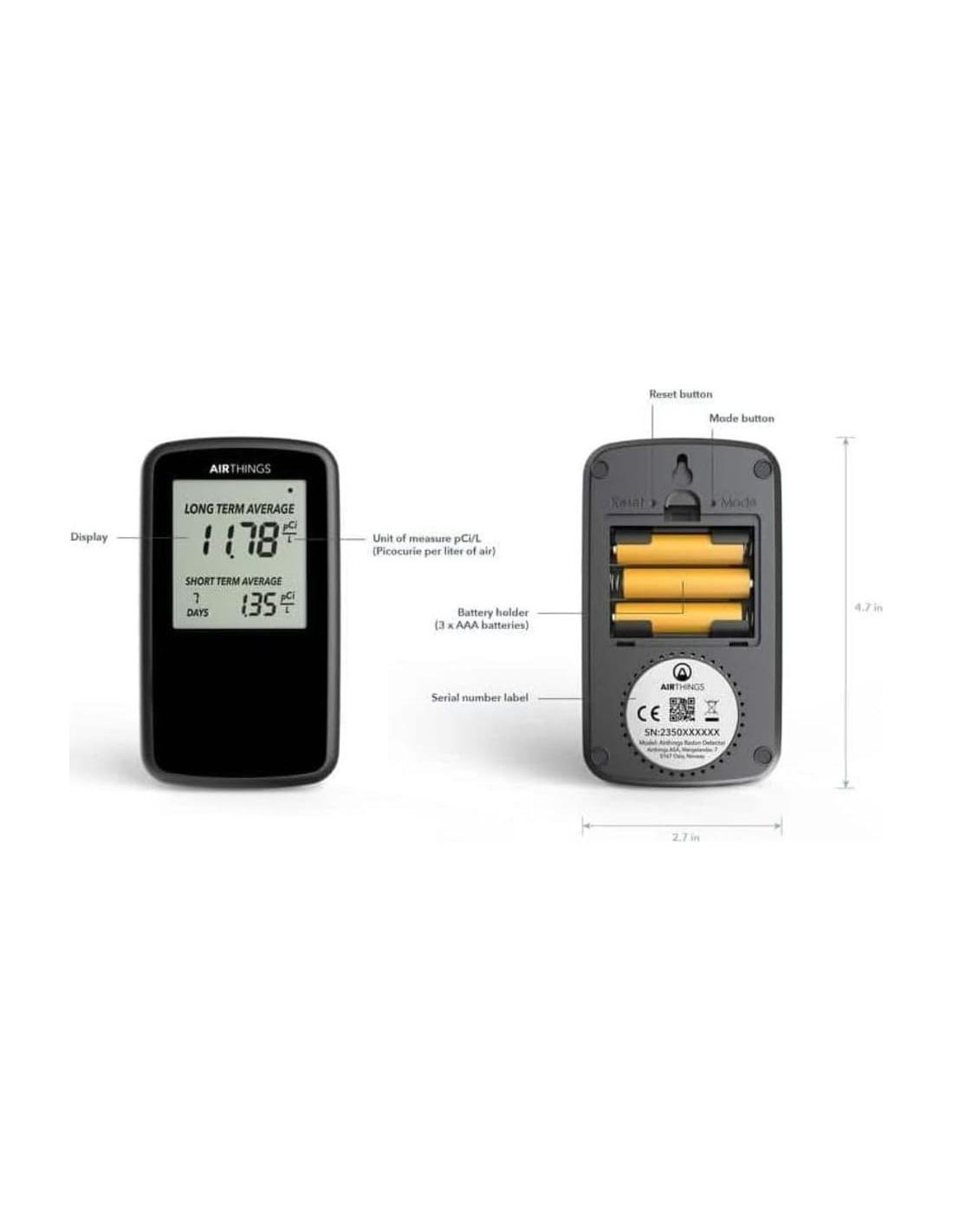RESULTADOS RÁPIDOS: recibe tu primera medición de radón en 24 horas, más precisa después de 7 días. MONITOREO CONTINUO Y A LARGO PLAZO: Monitorea el gas radón causante de cáncer. El monitoreo a largo plazo es necesario ya que los niveles de radón fluctúan diariamente. PRECISO: a diferencia de una prueba de carbón, nuestros detectores no se ven afectados por interferencias electromagnéticas y polvo, funcionan de manera óptima en humedad inferior al 85%, y pueden ser reiniciados y reutilizados infinitamente. SIN COSTOS DE LABORATORIO: Debido a que este monitor está monitoreando continuamente accesible en tiempo real, nunca pagarás un costo de laboratorio para acceder a los datos de tus niveles de radón. TECNOLOGÍA AVANZADA: la arquitectura interna del detector digital de radón Airthings proviene de tecnología avanzada normalmente reservada para detectores de tipo comercial. FÁCIL DE ENTENDER: la pantalla LCD muestra las concentraciones promedio diarias, semanales y a largo plazo. BAJO MANTENIMIENTO: 3 baterías AAA te proporcionarán aproximadamente 2 años de tranquilidad. PRIMERO EN SU CLASE: El primer detector de radón digital operado por batería. Monitorea tu hogar sin necesidad de un enchufe. DÓNDE DEBES MEDIR: El radón es un gas que ocurre de forma natural y se emite del suelo. Mide el piso más bajo de tu hogar para conocer tu riesgo.