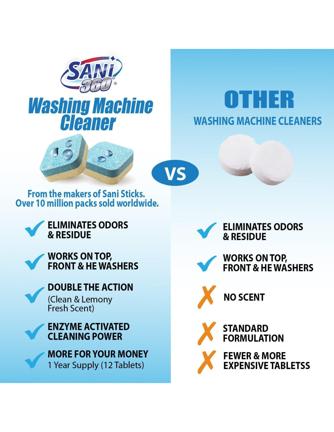 - Mantenimiento Regular: Usa un tratamiento mensual para el mantenimiento y mantener tu lavadora oliendo fresca y funcionando en su mejor estado. Este paquete incluye 12 tabletas del Limpiador de Lavadora Sani 360 para asegurar que tengas suficiente suministro hasta tu próxima compra.