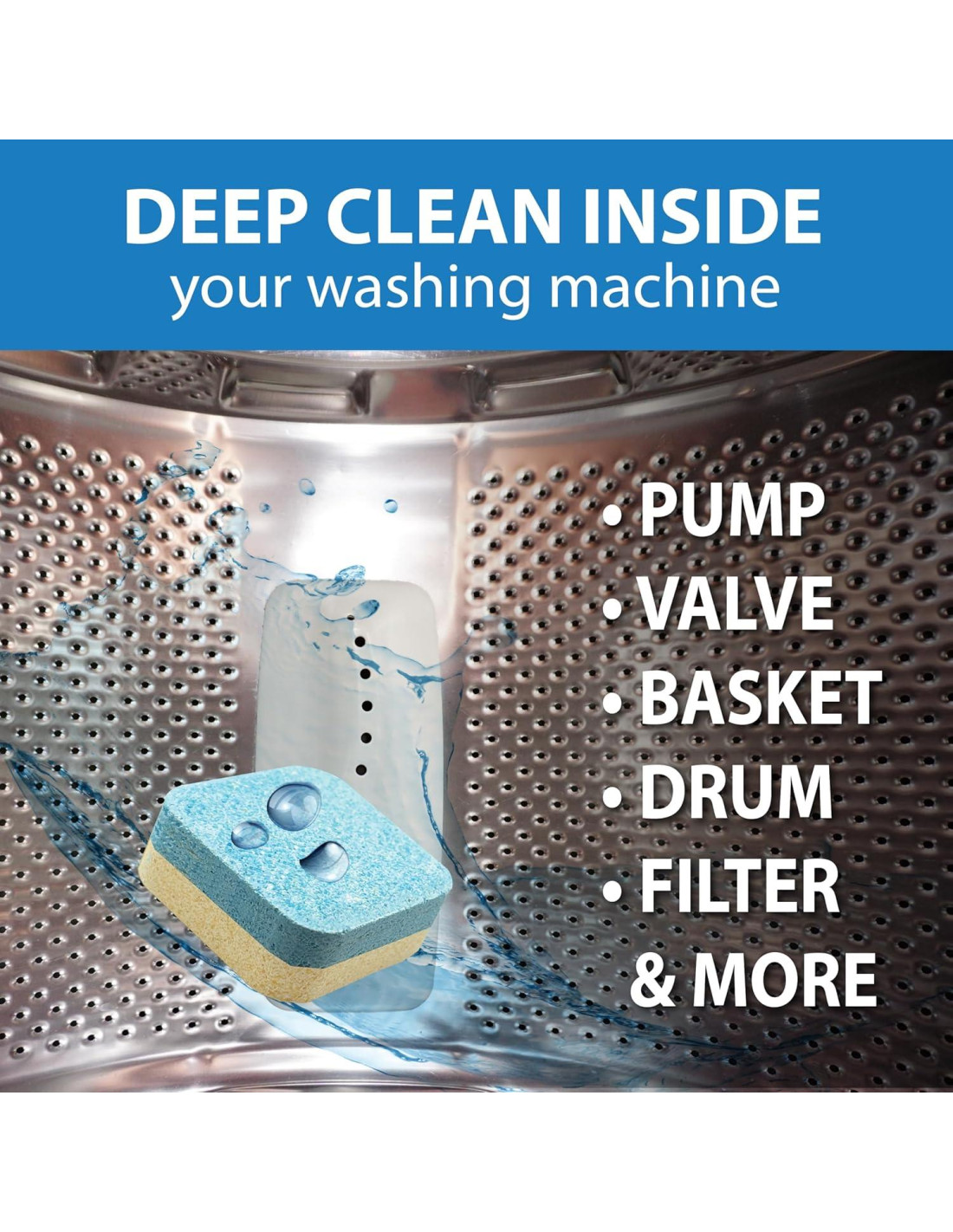 - Fácil de Usar: Deja caer una tableta directamente en el tambor. Ejecuta un ciclo normal en la configuración de AGUA CALIENTE para disolver efectivamente la tableta. Funciona muy bien en acumulaciones excesivas causadas por detergente o agua dura. Perfecto para usar en el lavabo de la lavadora después de lavar paños sucios, alfombrillas de baño, trapos de cocina o ropa de ejercicio.