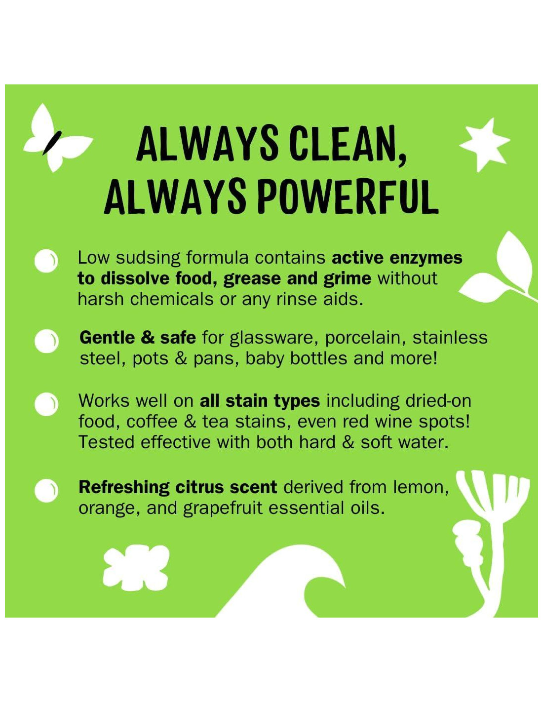 - PODEROSO PERO SUAVE: La fórmula de baja espuma contiene enzimas activas para disolver alimentos, grasa y suciedad sin necesidad de químicos fuertes o ayudas de enjuague. Funciona bien en todo tipo de manchas, incluyendo alimentos secos, manchas de café y té, ¡incluso manchas de vino tinto! Efectivo con agua dura y blanda.