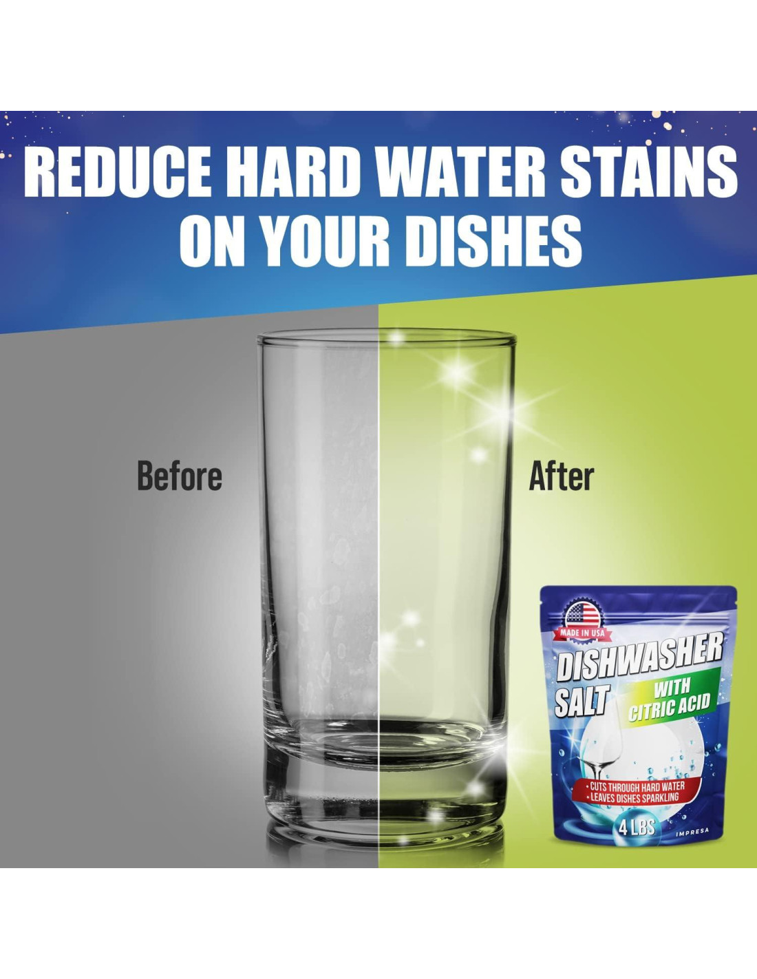 Obtén un impulso extra de limpieza No es necesario perder tiempo y energía adivinando cuánta cantidad de ácido cítrico mezclar con la sal de tu lavavajillas. Mejora el rendimiento de limpieza de tu máquina con esta mezcla patentada de ácido cítrico y sal para lavavajillas, fabricada en EE. UU., para agua dura. Las propiedades de limpieza en polvo del ácido cítrico se unen a los minerales y metales en el agua dura, evitando que interfieran con el proceso de limpieza. Este removedor de manchas de agua para lavavajillas ayudará a que tus copas, utensilios de cocina y utensilios salgan más limpios y brillantes. Mantén la eficiencia de tu lavavajillas y previene depósitos minerales en tuberías y boquillas con esta sal desincrustante para lavavajillas. Esta mezcla de sal y ácido cítrico está hecha con sal gruesa pura, sin compuestos aglomerantes, yodo ni ningún otro aditivo. Mejora tus suministros para lavavajillas Optimiza tu rutina de lavavajillas con el ácido cítrico premezclado en este limpiador para agua dura. Esta combinación de limpieza para lavavajillas ayuda a prevenir la acumulación de sarro que puede causar daños a tu máquina con el tiempo, lo que lleva a reparaciones o reemplazos costosos. Ten una mayor cantidad a mano con esta bolsa de 1.81 kg de limpiador para agua dura para lavavajillas. Disfruta de una compatibilidad prácticamente universal con la sal ablandadora de agua Impresa para Bosch, Miele, Thermador, Whirlpool y otros lavavajillas con una función de ablandador. Consulta las instrucciones del fabricante antes de usar este removedor de manchas de vidrio para agua dura. Mantén tu lavavajillas funcionando sin problemas y tus platos limpios con esta sal limpiadora para lavavajillas. Nota: Este es un producto de posventa fabricado por Impresa. Cualquier otra marca mencionada es solo para fines ilustrativos y no está de ninguna manera afiliada a Impresa, ni la respalda.