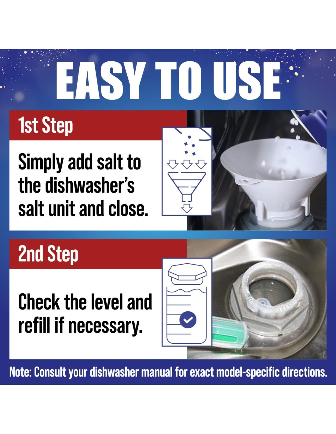 - Premezclado con Ácido Cítrico - No es necesario adivinar la cantidad adecuada de ácido cítrico para limpiar tus platos. Con esta mezcla patentada de enjuague para lavavajillas premezclada, simplemente viértelo y deja que tu máquina haga el resto. Este limpiador está hecho con sal gruesa pura, sin compuestos aglomerantes, yodo ni ningún otro aditivo