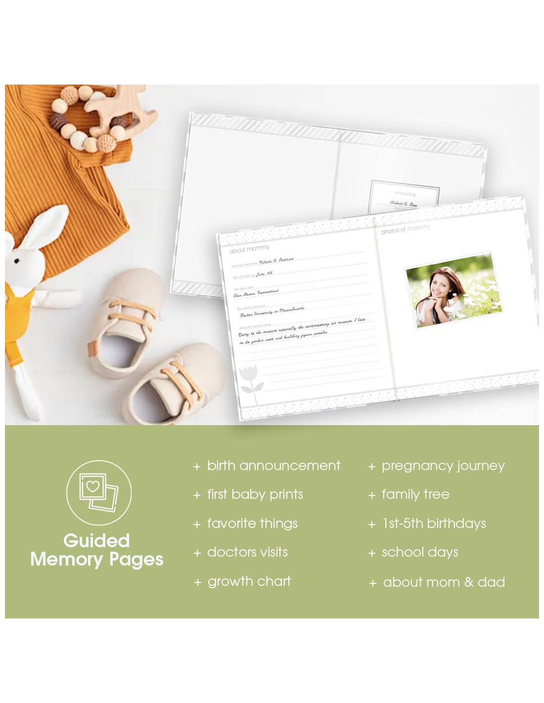 - Secciones Perfectas para Fotos: ¡Cárgalo de fotos! Desde esas primeras instantáneas de ultrasonido hasta fiestas de cumpleaños y travesuras navideñas, este libro tiene espacio para todos los recuerdos que querrás recordar. Dimensiones: 10.75" de alto x 9" de ancho x 0.563" de profundidad con inserto de foto de 3" x 3" en la portada.