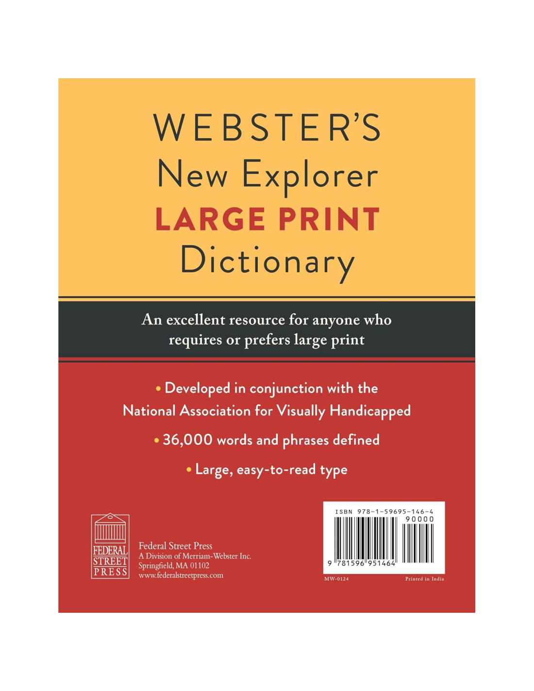Este diccionario es un excelente recurso para personas de cualquier edad que requieren o prefieren letra grande. Desarrollado en conjunto con la Asociación Nacional para Personas con Discapacidad Visual, la agencia pionera en establecer estándares para publicaciones en letra grande, este diccionario es ideal para usar en casa y también es una herramienta efectiva en el aula. Más de 40,000 palabras y frases. Tipo grande y fácil de leer. Las entradas incluyen parte del discurso, pronunciación y ortografías alternativas. LOS DISEÑOS DE LA TAPA DEL LIBRO PUEDEN VARIAR: Recientemente rediseñamos la tapa del Diccionario de gran tamaño de Webster, pero el contenido interior del libro es el mismo ya sea que obtenga el diseño de tapa original o el nuevo diseño de tapa. Creado en cooperación con los editores de Merriam-Webster, el principal proveedor de información lingüística de América.