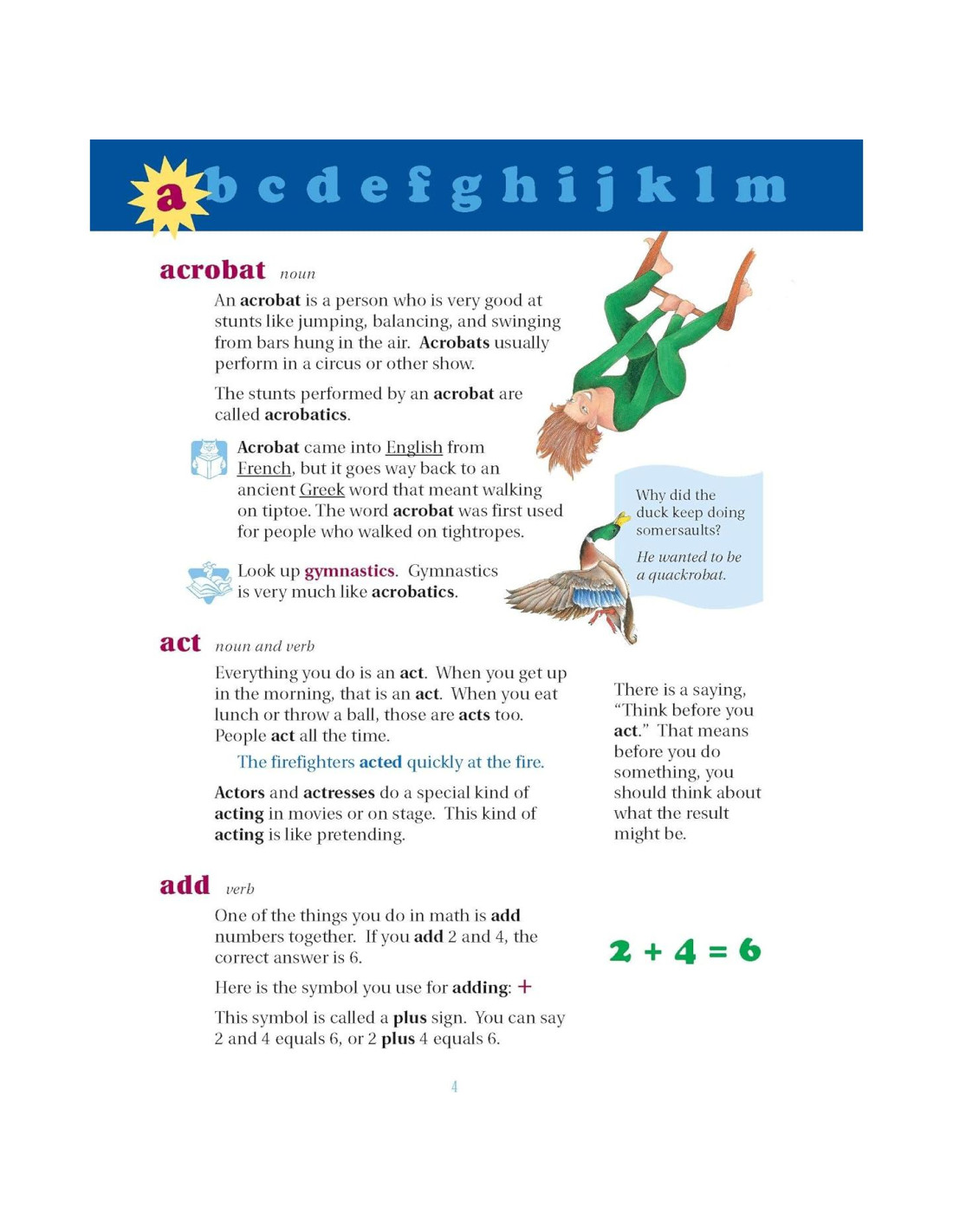 Un tesoro único de palabras especialmente escrito para niños en grados K-2, edades 5-7. Este diccionario para principiantes introduce a los jóvenes lectores a 3,000 palabras utilizando 1,000 entradas y cientos de ilustraciones cautivadoras de la querida ilustradora infantil, Ruth Heller. Con esta herramienta de aprendizaje indispensable, los niños se divertirán descubriendo más sobre las palabras, sus significados y cómo deletrearlas. Enseña habilidades básicas de diccionario: alfabetización, ortografía, partes del discurso, sonidos de letras, uso de sinónimos y antónimos, y homógrafos y homófonos. Chistes, acertijos, poemas y datos divertidos sobre palabras hacen que el aprendizaje sea divertido. Referencias a historias populares, cuentos de hadas, mitos y rimas infantiles despiertan la imaginación y fomentan la exploración del lenguaje. Las palabras, frases y sus significados se discuten en oraciones completas apropiadas para la edad, con ejemplos de uso para mostrar cómo se utilizan en contexto. ¡Descubre un mundo de información en este diccionario atractivo y a todo color para niños!