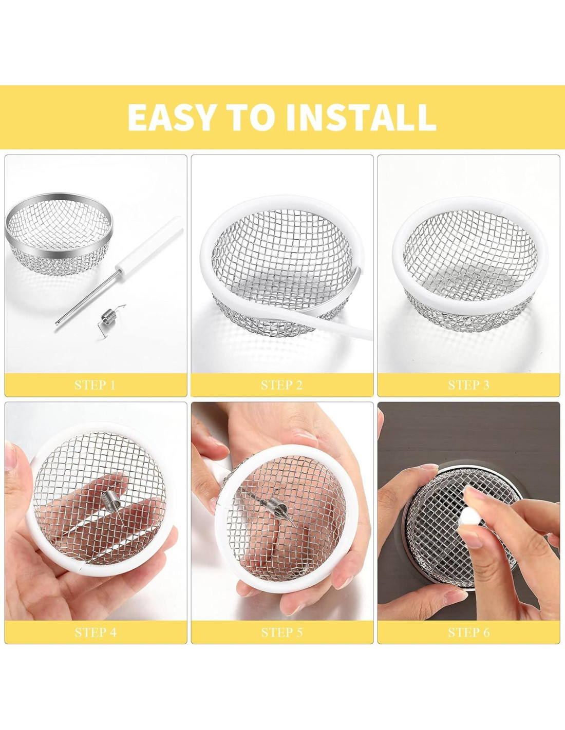 Hecho de acero inoxidable de calidad para asegurar que las ventilaciones estén intactas y no corroídas, protegiendo así tu RV. Con cada malla midiendo 0.3 pulgadas (0.76 cm), la malla es lo suficientemente grande para una circulación de aire óptima, pero lo suficientemente pequeña para mantener a los insectos fuera. Los insertos de goma de silicona son resistentes al ruido y a los arañazos, incluso en clima frío. Obtén la cubierta de malla de acero inoxidable, ganchos de resorte, herramienta de instalación lista. Asegúrate de que los ganchos de resorte funcionen bien. Pasa el gancho de un lado del gancho de resorte a través de la malla y queda atrapado. Sujeta la ranura de la herramienta de instalación al gancho de resorte, aplica fuerza para estirar el gancho. Estira continuamente hasta que el gancho de resorte agarre el agujero o la varilla, finaliza la instalación.