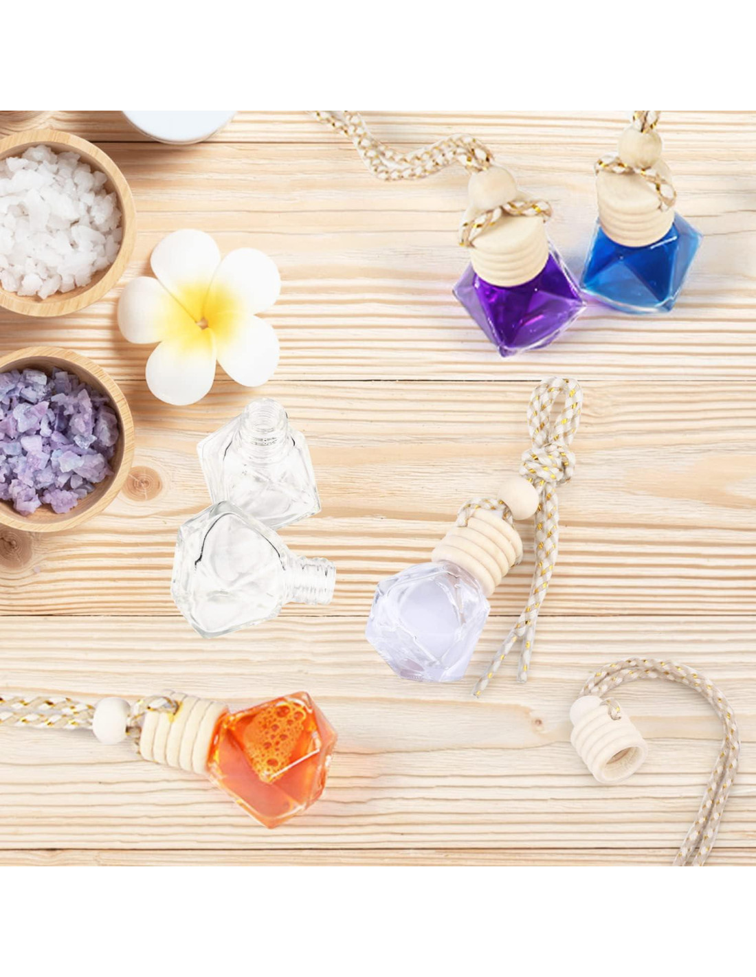- [Paquete Incluido] 50Pcs botella de perfume de vidrio para auto, cada frasco de vidrio viene con tapón interior de plástico, tapas de madera, cuerda de algodón para colgar, Color: transparente, viene con 1 embudo, 1 pipeta.