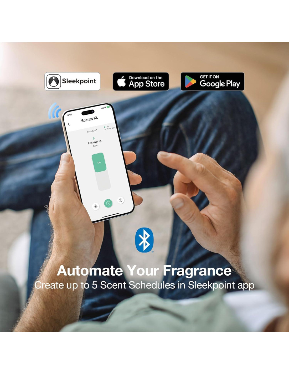 - Configuraciones Flexibles Habilitadas por la Aplicación Sleekpoint: Descarga la aplicación Sleekpoint desde la App Store de Apple (iOS) o Google Play Store (Android OS) y disfruta de controles completos sobre Scent XL a través de Bluetooth: [Encender/Apagar] Enciende o apaga fácilmente el dispositivo o ventilador de refuerzo. [Programación] Configura hasta 5 horarios/escenas de difusión para diferentes momentos y días para satisfacer tus necesidades en diversas ocasiones. [Tiempo de Difusión] 3 seg - 5 min [Tiempo de Pausa] 5 seg - 19 min. Por favor, mantente dentro de 20 pies (6.1 m) del dispositivo para conectarte