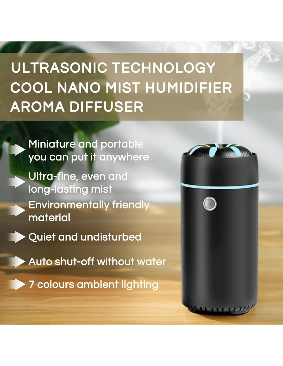 - Difusor de Ambientador de Aire de Coche Inteligente: Los difusores de coche para humidificador de aceites esenciales cuentan con un funcionamiento silencioso, 7 colores de luz LED, interruptor de seguridad automático para evitar sobrecalentamiento en caso de que se quede sin agua