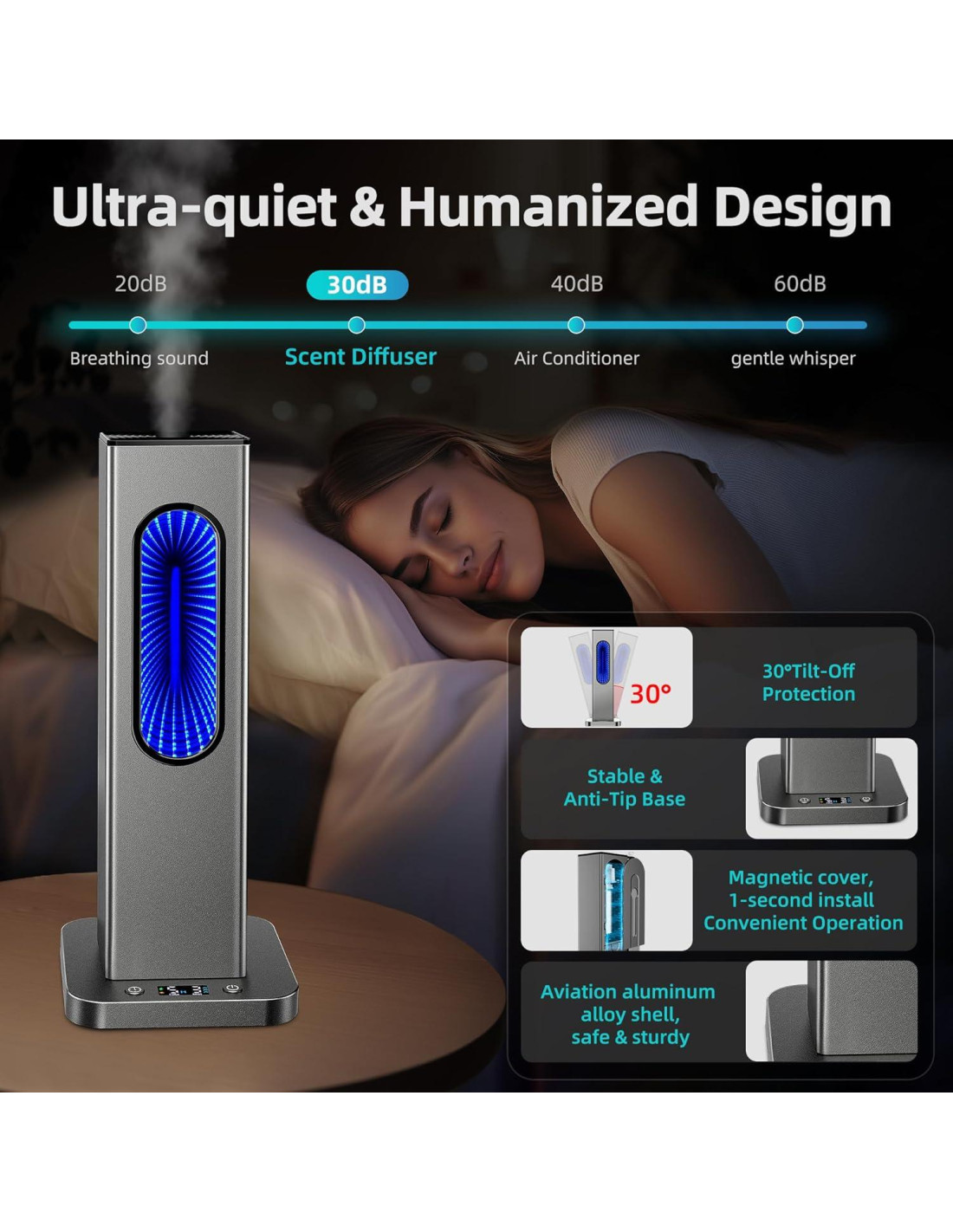 - El difusor de aroma utiliza tecnología de motor avanzada, salida estable y atomización suave sin ruido, y sin interrupción de ningún momento de tranquilidad. Adecuado para dormitorios, habitaciones de bebés o el lugar de trabajo. Con una función de temporizador de 0-9 horas, se puede usar por la noche o configurarse libremente para disfrutar de la comodidad y concentración que brinda la fragancia en tranquilidad.