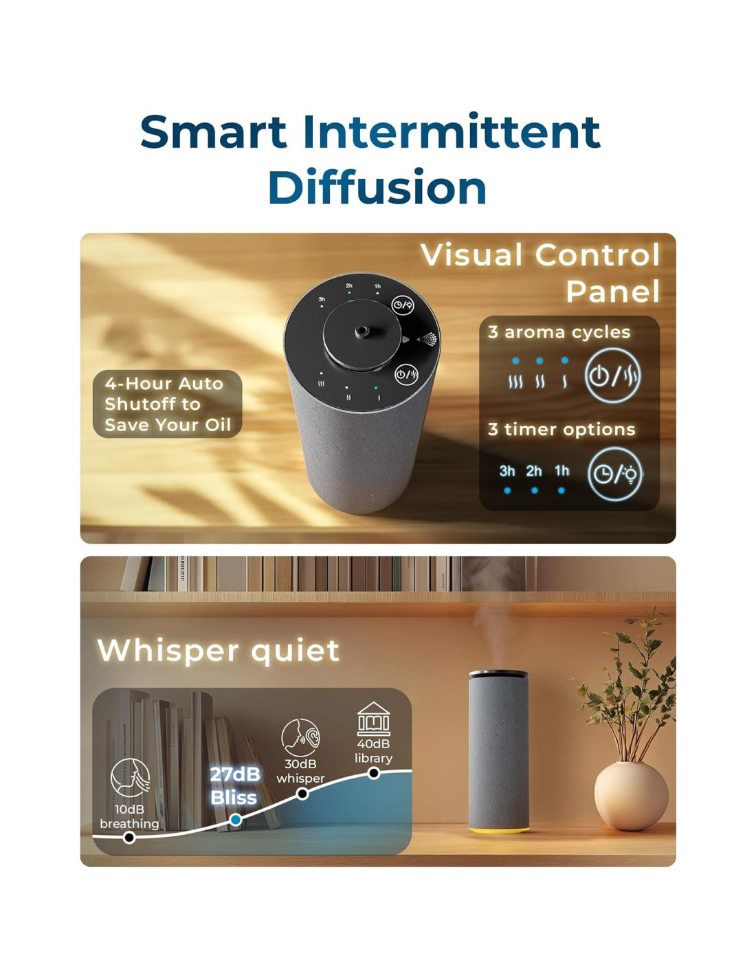 - Versátil, Multifuncional: difusores sin agua para usar en tu dormitorio, oficina o viaje; difusor inteligente con panel táctil, iluminación atmosférica, ciclos de aroma ajustables (bajo/medio/alto), temporizador de apagado automático (1h, 2h, 3h, 4h)