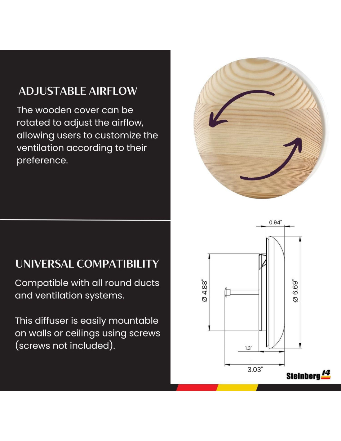- Flujo de Aire Ajustable: Disfruta de control total sobre el flujo de aire de la habitación con la ventilación de aire manualmente ajustable. Simplemente girando la Cubierta Frontal de Madera, puedes ampliar o reducir la abertura, personalizando efectivamente la ventilación según tu preferencia. El flujo de aire se puede cerrar completamente si se desea.