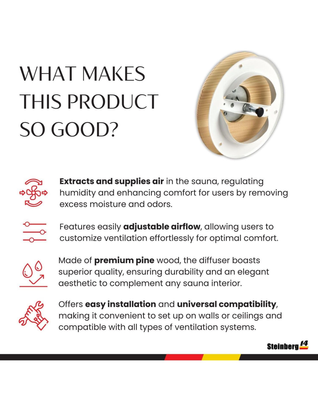 - Materiales de Alta Calidad: La Cubierta Frontal de la ventilación redonda para sauna está hecha de madera de pino premium, asegurando durabilidad, longevidad y una estética elegante que complementa cualquier decoración interior. El Cuerpo del Difusor de la ventilación de extracción está hecho de chapa de acero galvanizado con recubrimiento de polímero blanco RAL 9016, asegurando robustez contra la corrosión y el desgaste.