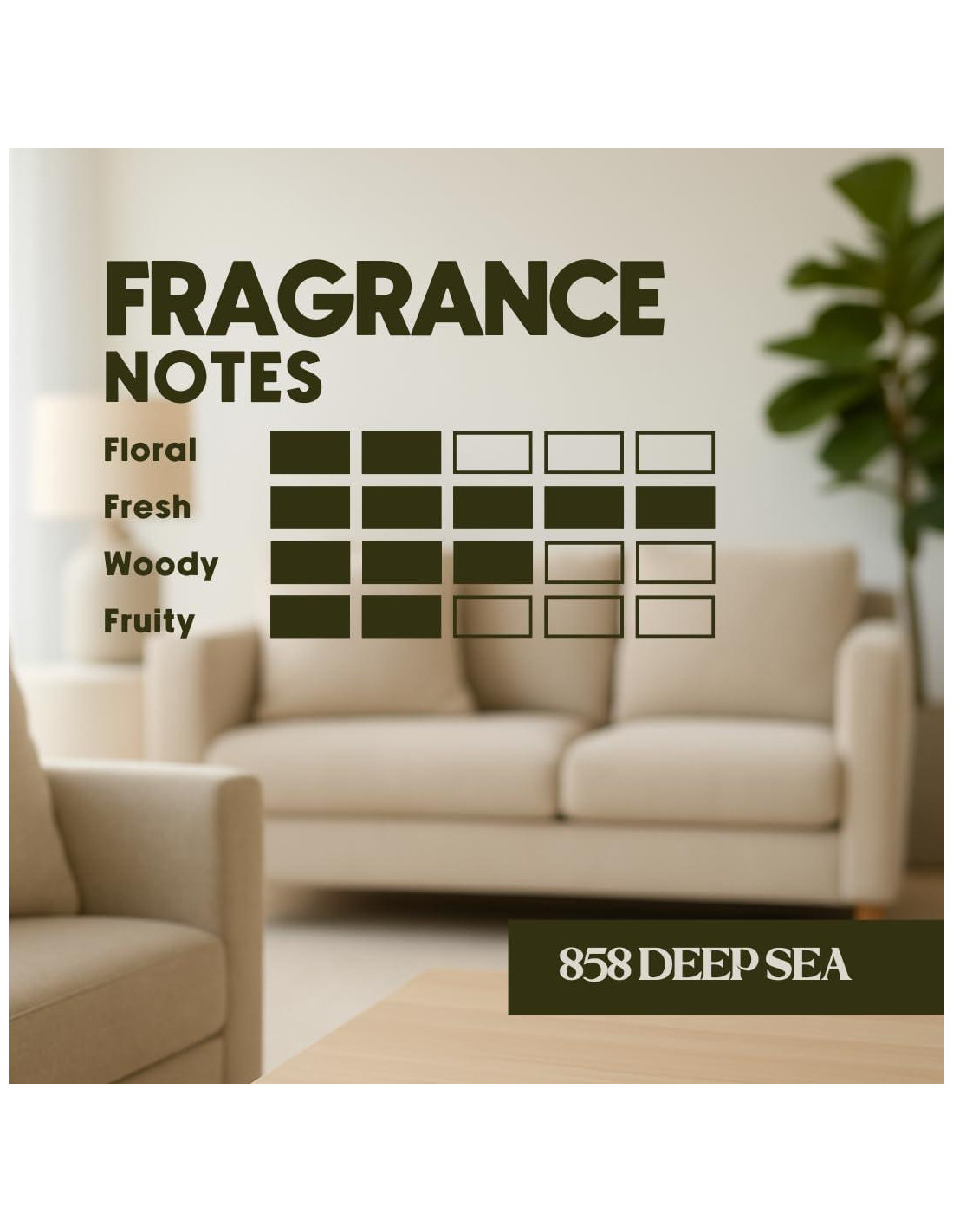 - PERFIL DE FRAGANCIA - 858 MAR PROFUNDO: Una audaz mezcla acuática con cítricos picantes, sal marina y ciruela madura en la parte superior, seguida de cardamomo picante y asentada en una base suave de ámbar y almizcle. Un aroma rico y vigorizante que evoca la profundidad y el misterio del océano.