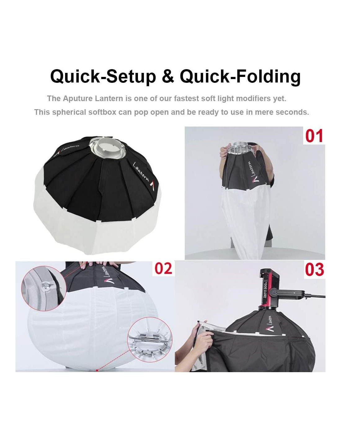 - Configuración Rápida y Plegado Rápido: La Aputure Lantern puede abrirse y estar lista para usar en cuestión de segundos. Con la Linterna podrás producir luz suave y uniforme dondequiera que tus sesiones de fotos te lleven.