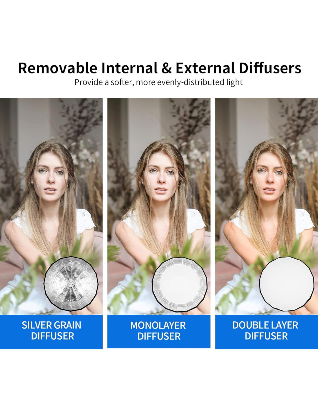 - Marco de paraguas de liberación rápida sin ensamblaje, ¡tan fácil como abrir un paraguas normal! Difusores internos y externos removibles. Puedes producir una hermosa luz difusa después de simplemente configurarlos.