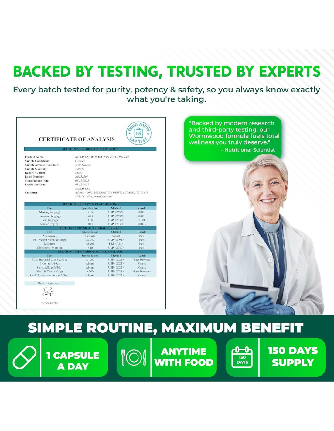 - Suministro de Cinco Meses: Proporcionando 150 cápsulas en cada botella, el Suplemento de Ajenjo NuraFuse asegura un conveniente suministro de cinco meses, requiriendo solo una cápsula diaria para una fácil incorporación en tu rutina diaria